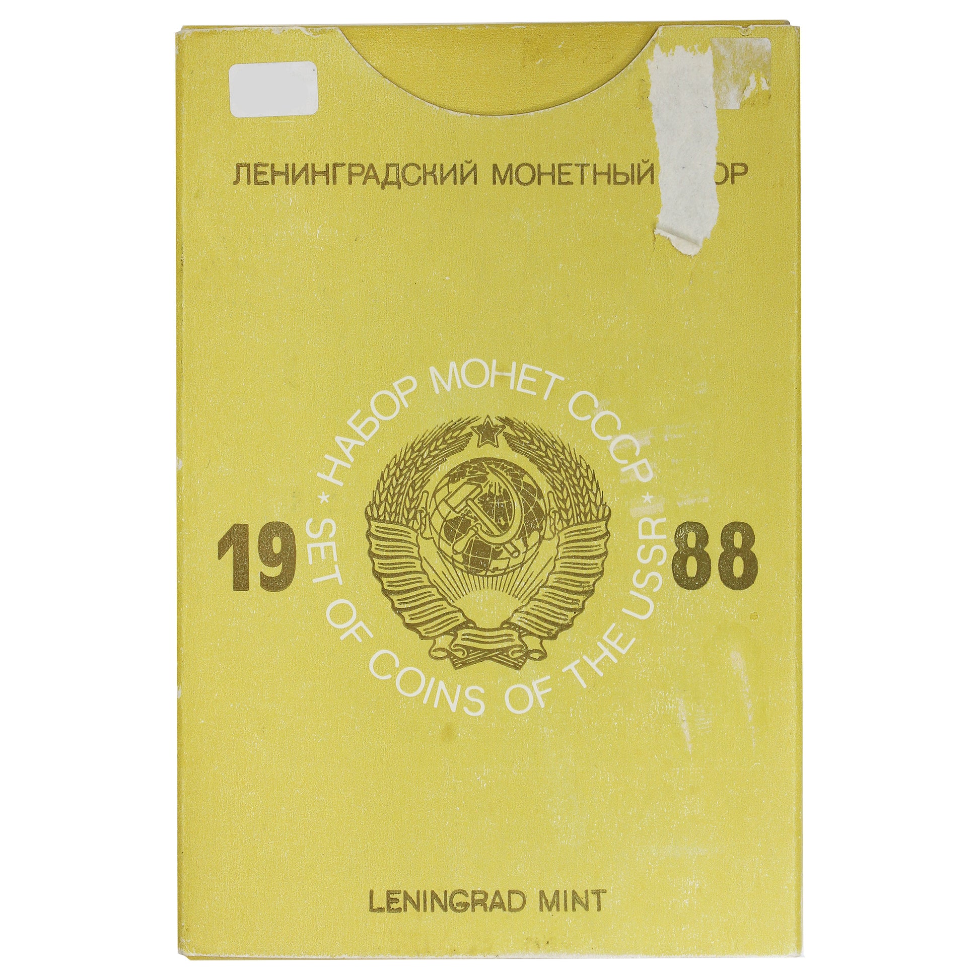 The 1988 Coins of the USSR 9-Coin Mint Set with Leningrad Mint Token includes nine circulated coins from the Soviet Union: 1 Kopeck, 2 Kopecks, 3 Kopecks, 5 Kopecks, 10 Kopecks, 15 Kopecks, 20 Kopecks, 50 Kopecks, and 1 Rouble. The set also features a Leningrad Mint token. The coins are housed in a display holder that shows some scuffs and light scratches and comes in it's original packaging which shows some light wear.