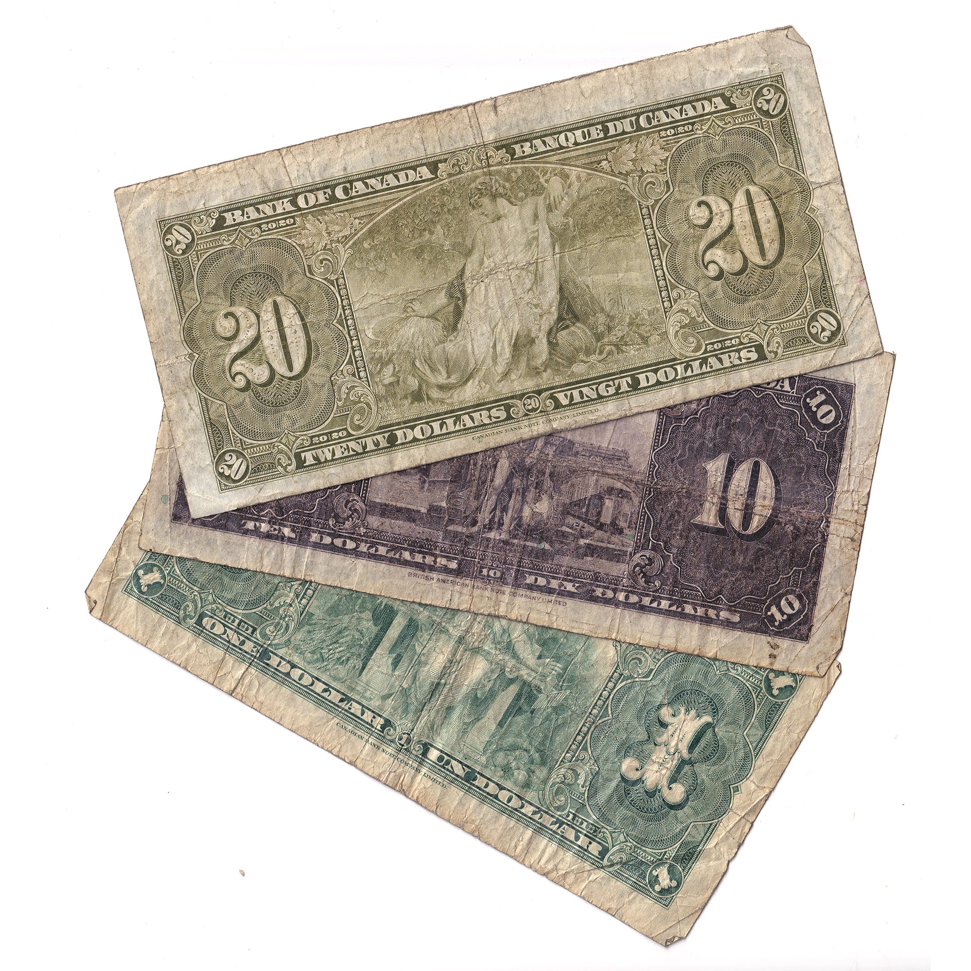 Lot of 3x 1937 Canada $1, $10 & $20 Notes, Circulated, 3Pcs. (impaired)