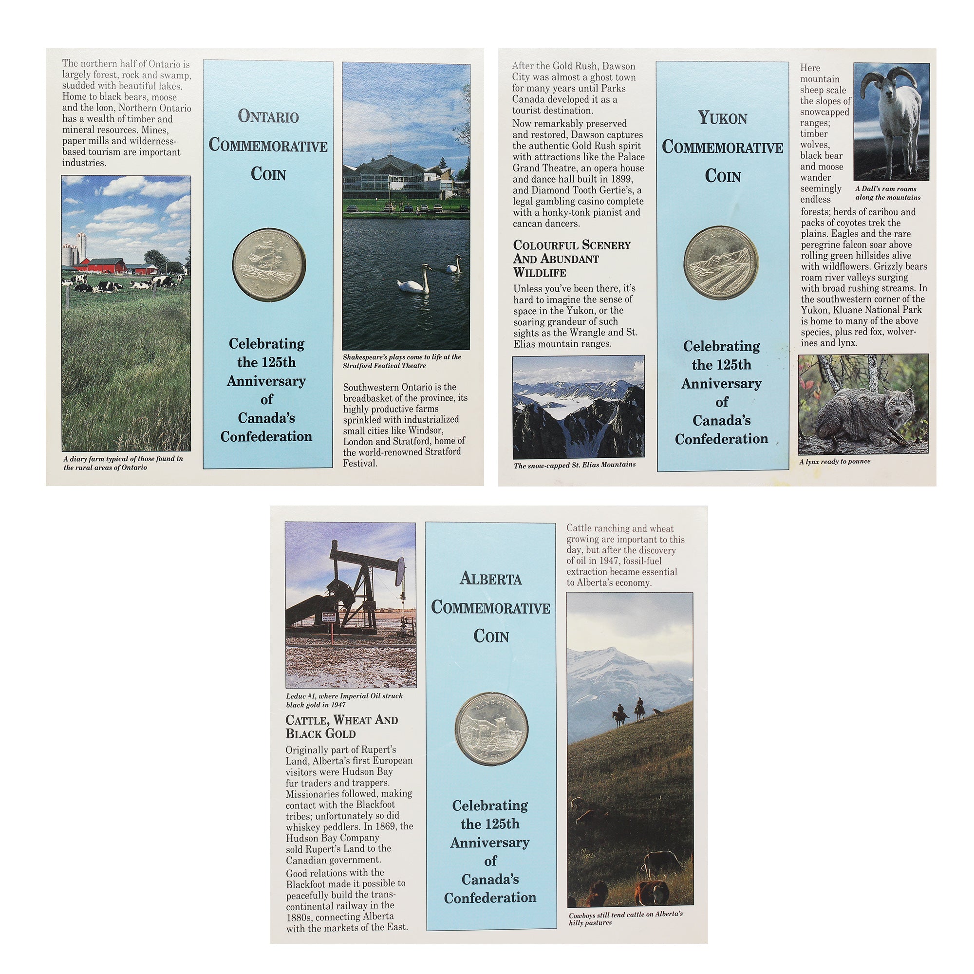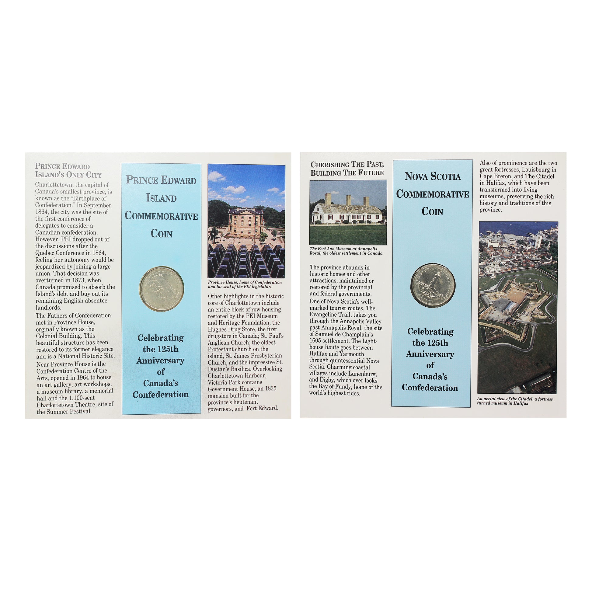 This lot features five sealed informational booklets from different Canadian provinces and territories, issued to celebrate Canada's 125th anniversary. The provinces and territories included are Yukon, 2x Nova Scotia, Prince Edward Island, Ontario, and Alberta. Each booklet provides historical facts and insights about its respective province and includes a 1992 Canada 25-cent provincial coin corresponding to the booklet.