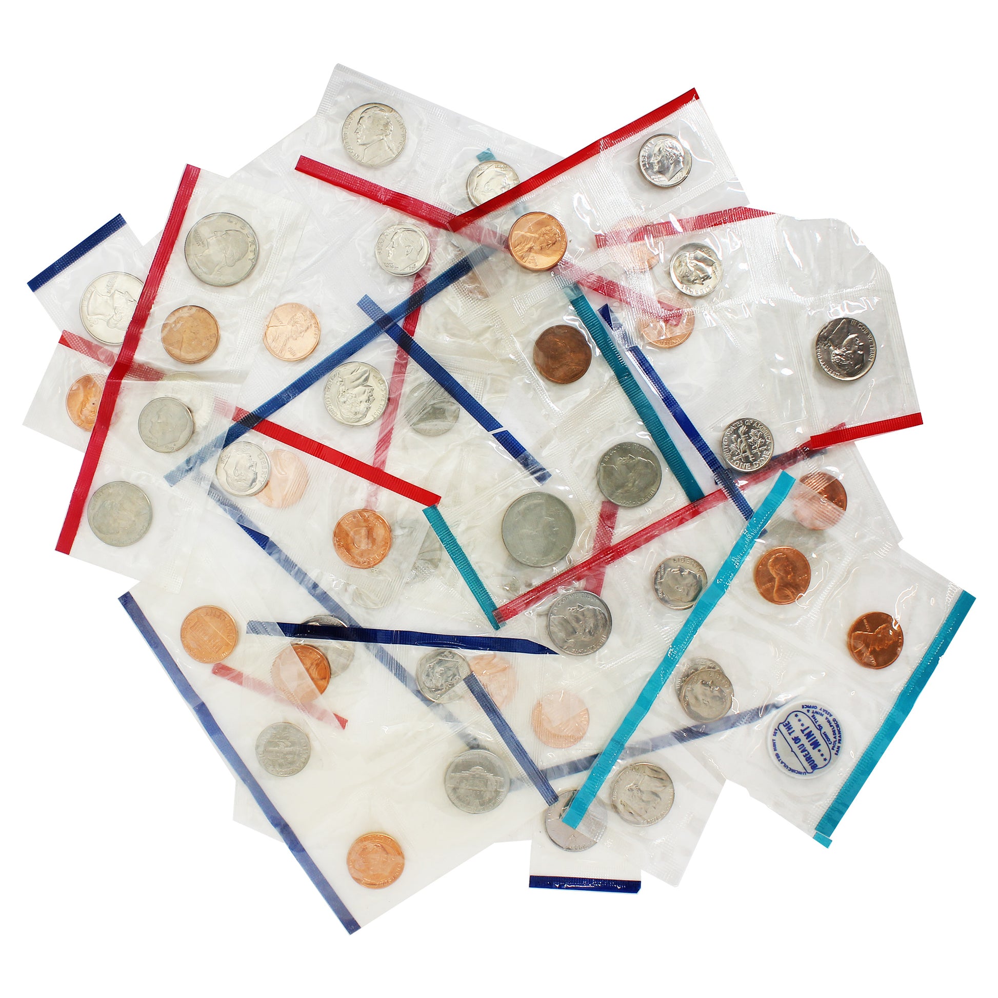 This lot features 50 U.S. decimal coins from various years, including cents, nickels, dimes, and quarters. Originally part of official U.S. Mint Sets, the coins remain in their original pliofilm packaging. Please note some of the coins in this lot show light toning and scratches.
