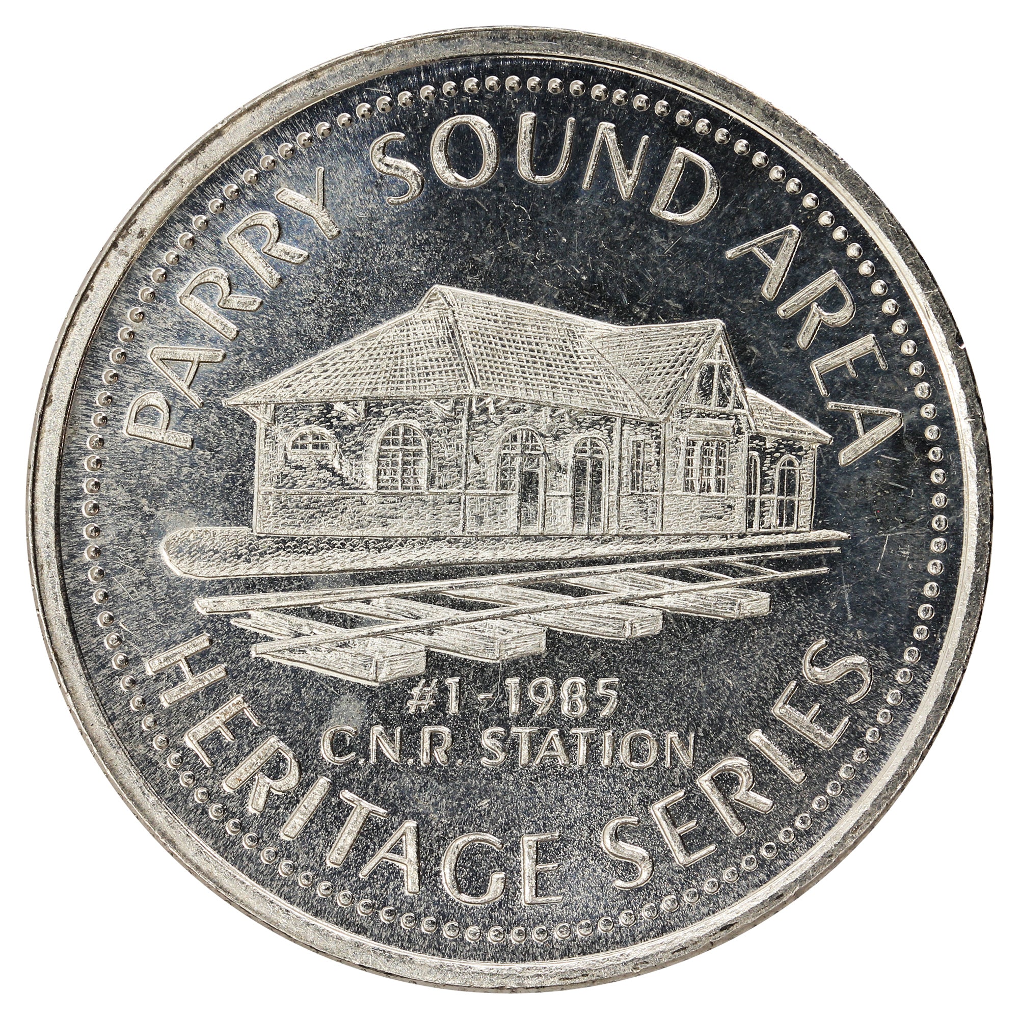 This trade dollar token was issued to promote tourism, local businesses and community events as well as celebrating Parry Sound, Ontario's heritage.