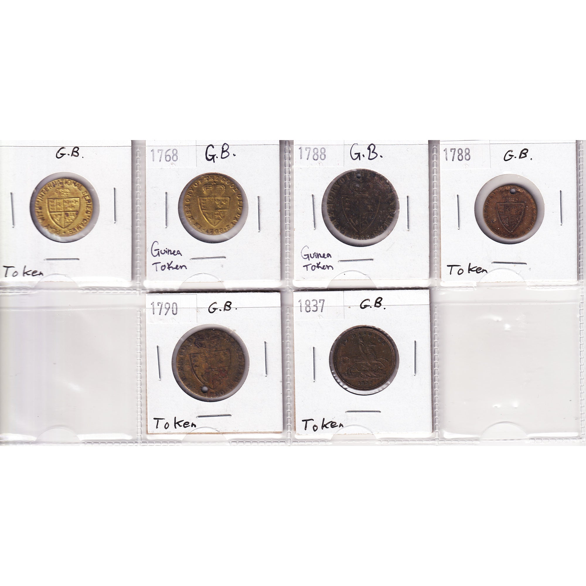 This lot features six Great Britain game counter tokens from 1791 to 1794, The lot also includes two Guinea tokens from 1768 and 1788.
