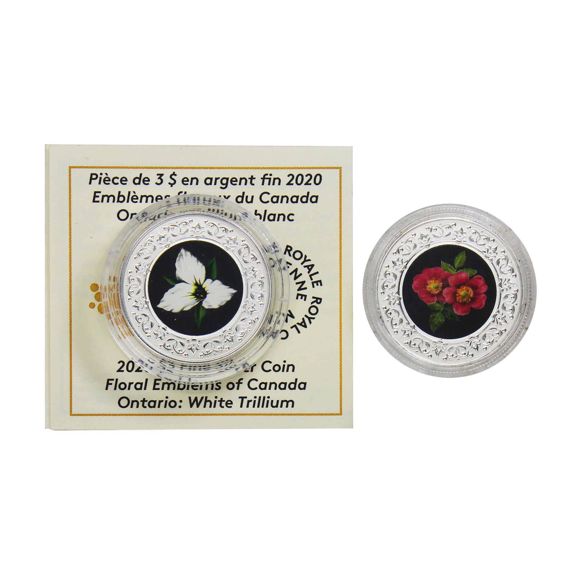 This lot includes two Canada $3 fine silver coins from the 2020 and 2021 Floral Emblems of Canada series featuring the 2020 White Trillium and the 2021 Alberta Wild Rose. Both coins are struck in .999 fine silver, each weighing 7.96 grams. Please note these are the encapsulated coins only without their original packaging. The 2020 White Trillium coin comes with its Certificate of Authenticity (CoA), while the 2021 Alberta Wild Rose does not.