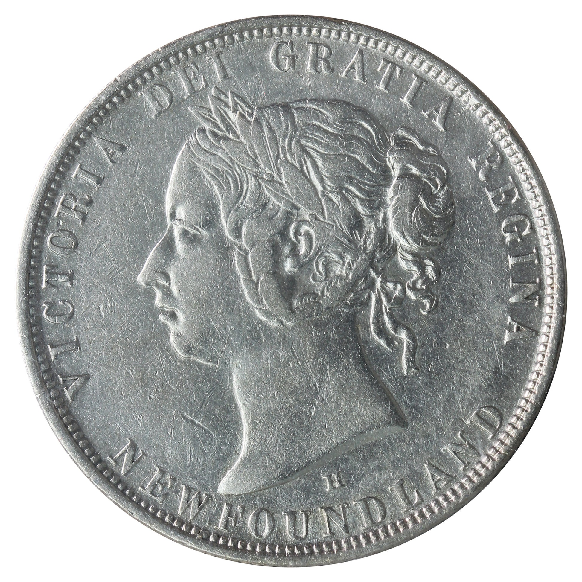 Victoria Portrait Obverse 1: There are four leaves at the top of the laurel crown. The upper-most leaf enters the legend band between the "E" and "I" and DEI. Victoria has a prominent upper lip. There is no dot before or after NEWFOUNDLAND.