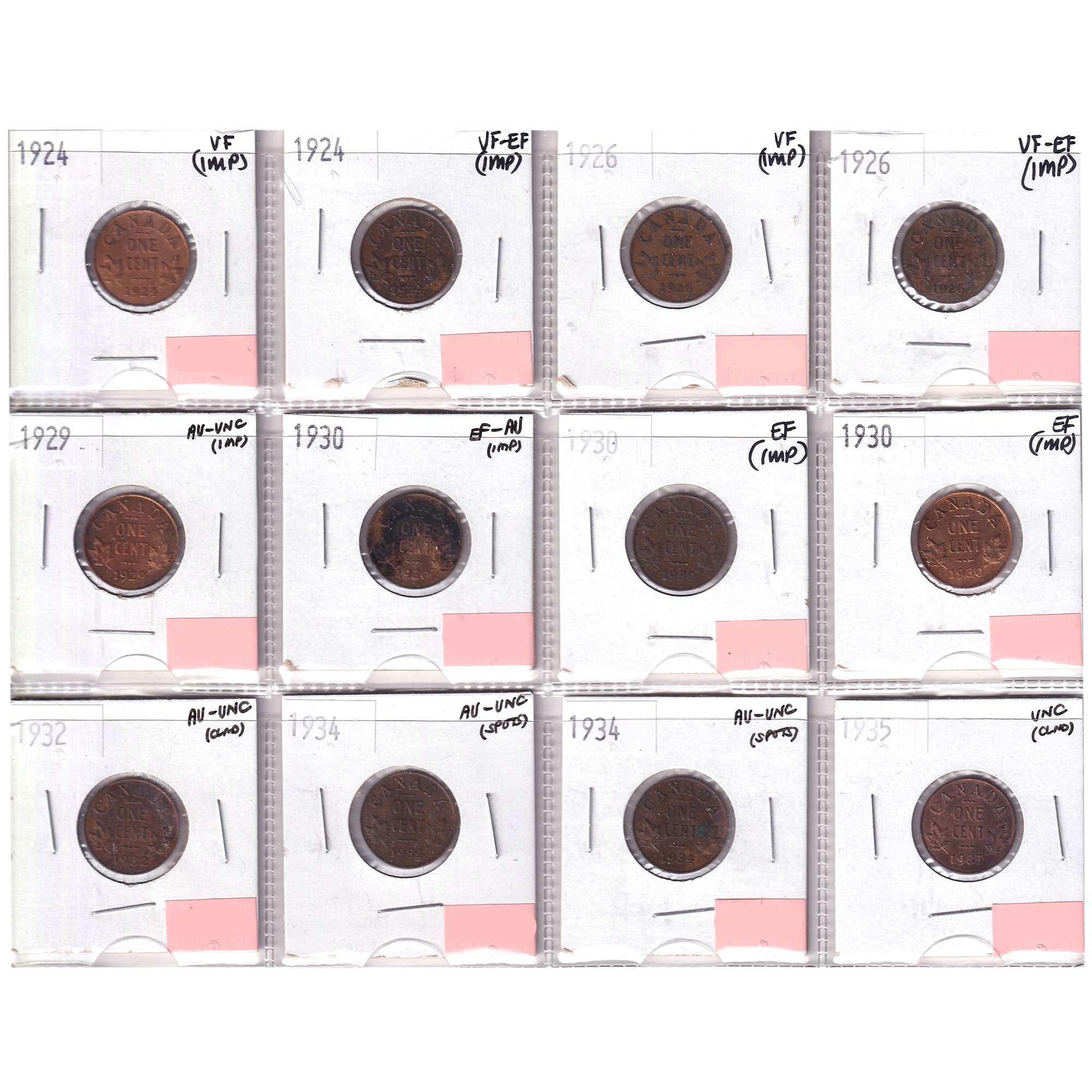 Group Lot of 12x 1924-1935 Canada 1-cent VF to UNC, 12pcs (Impaired)