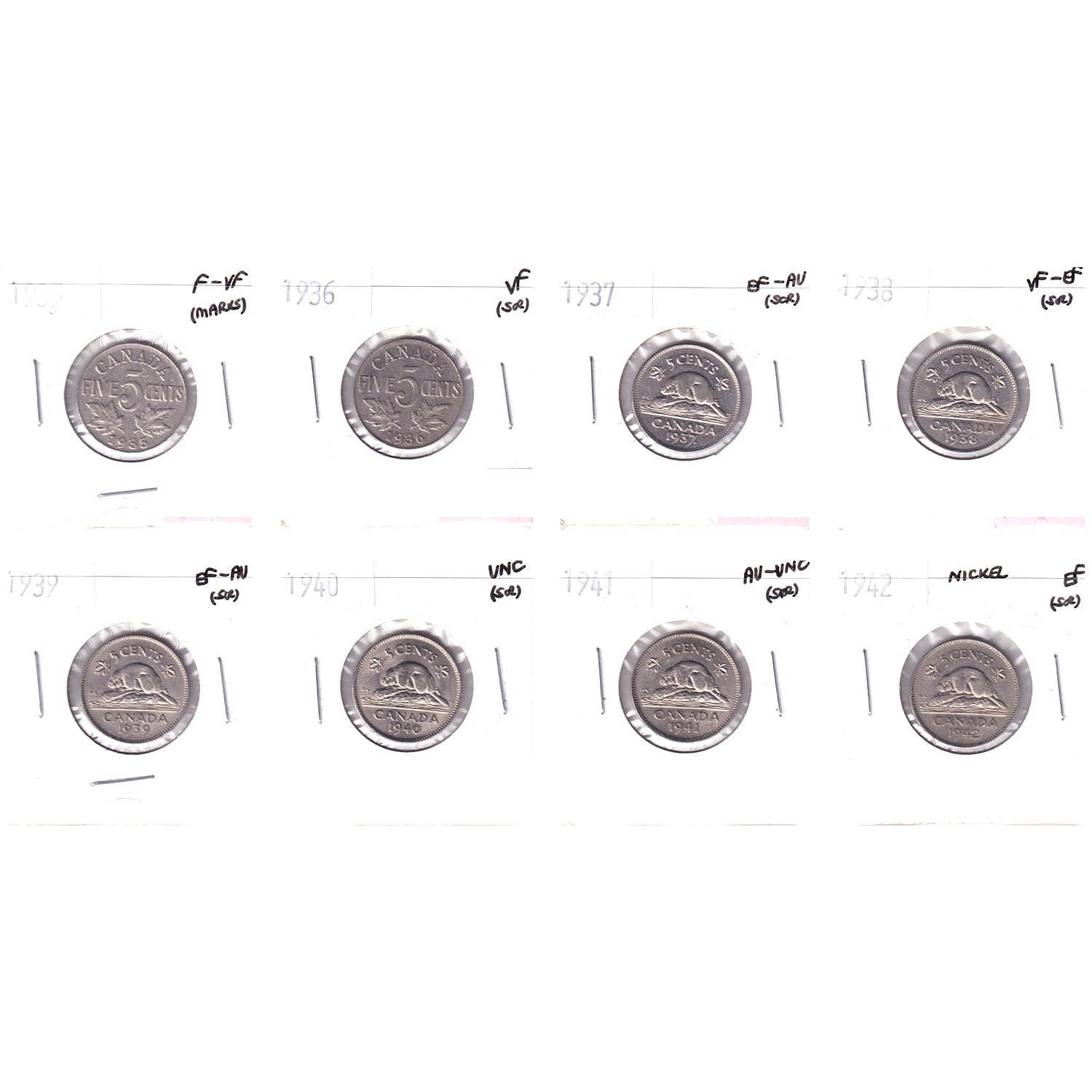 Lot of 8x 1935-1942 Canada 5-cents, F-VF to UNC, 8Pcs. (Impaired)