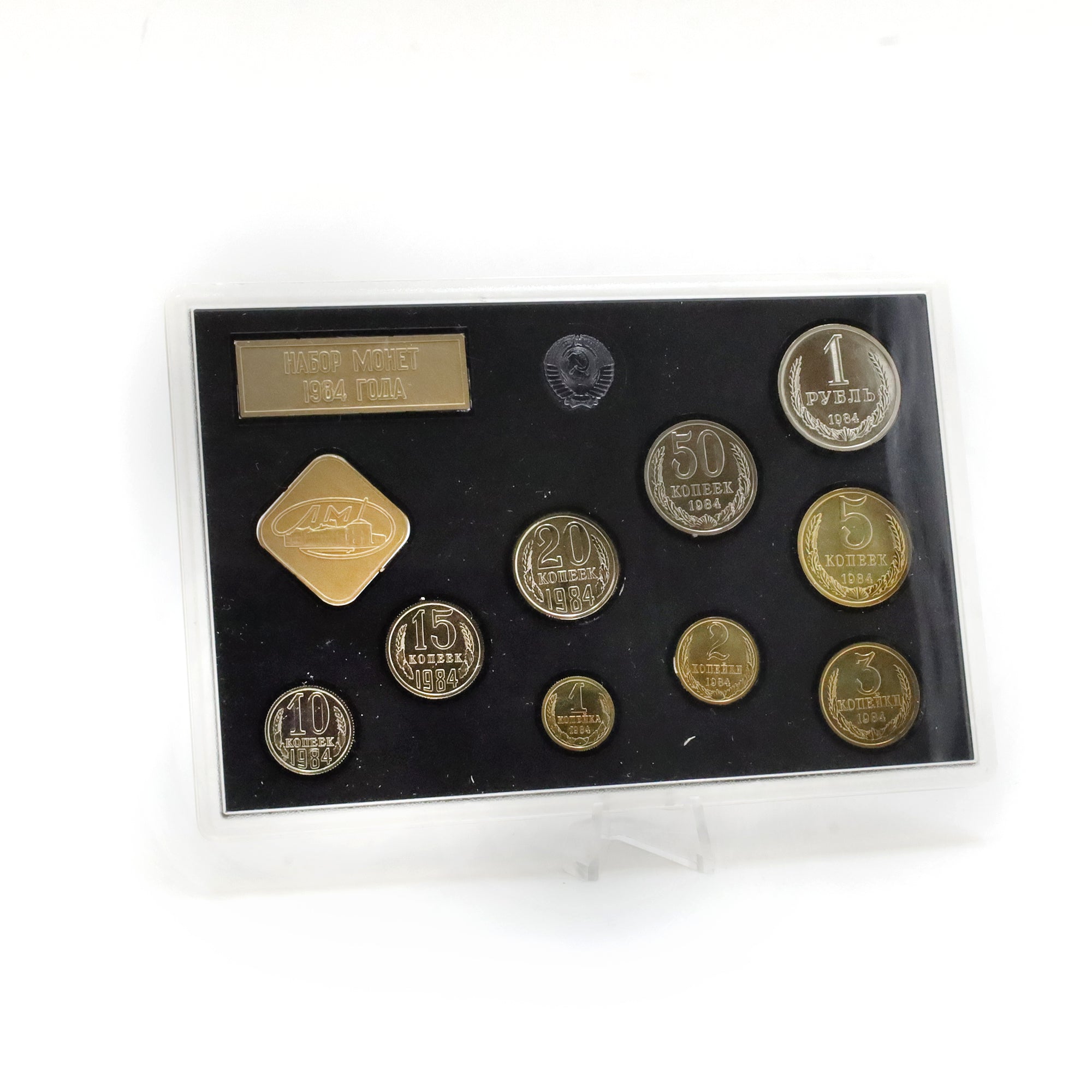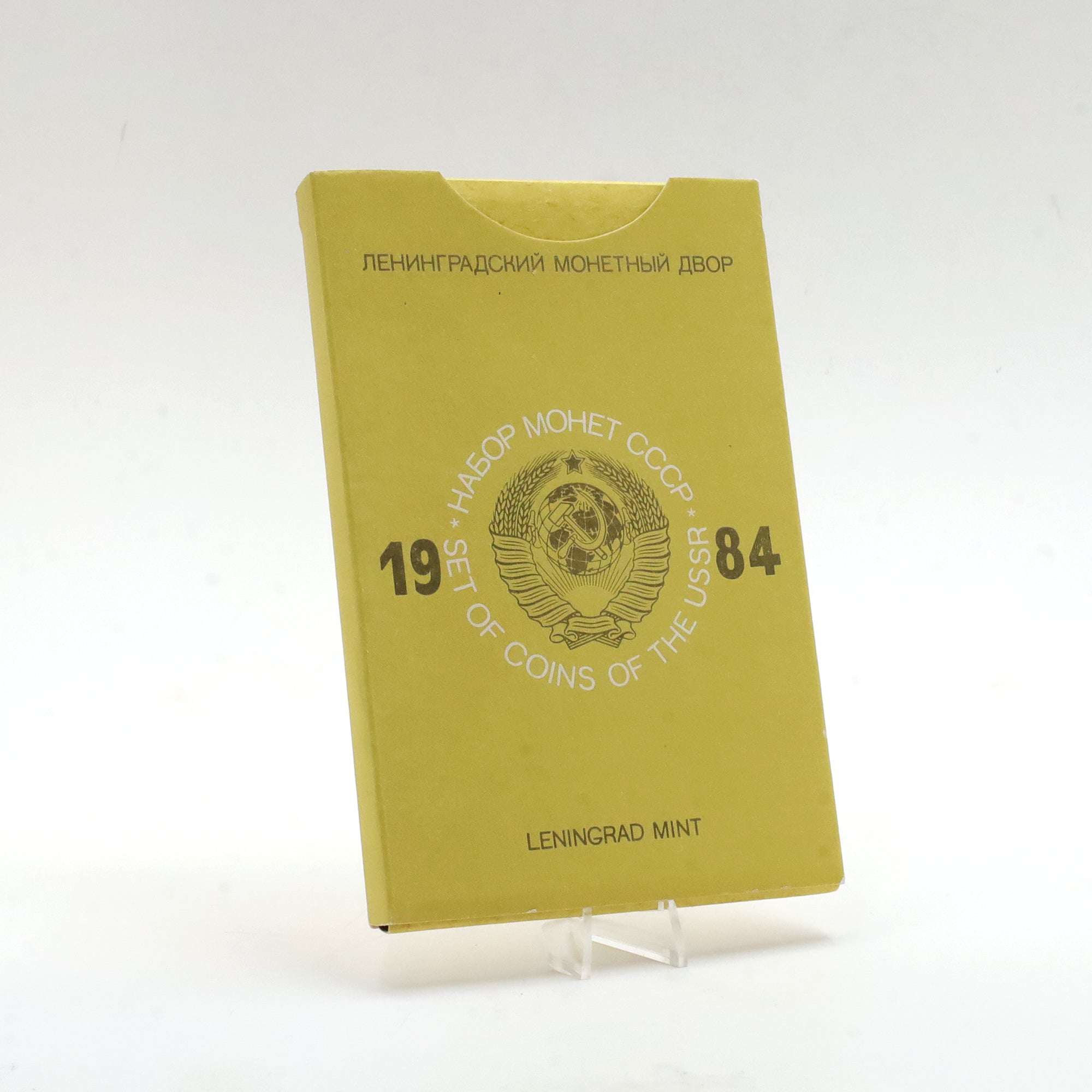This 1984 Soviet proof set includes nine coins and one mint token: 1 kopeck, 2 kopecks, 3 kopecks, 5 kopecks, 10 kopecks, 15 kopecks, 20 kopecks, 50 kopecks, 1 rouble, and a Leningrad mint token. Coins come presented in a plastic holder with Russian and English text. Original packaging is included and in excellent condition. Plastic holder has some minor scratches and scuffs; see images for details.
