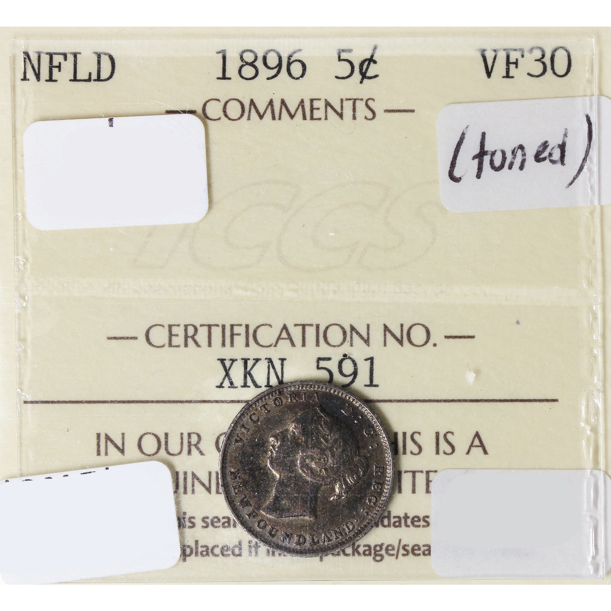 1896 Newfoundland 5-cents ICCS Certified VF30 Toned