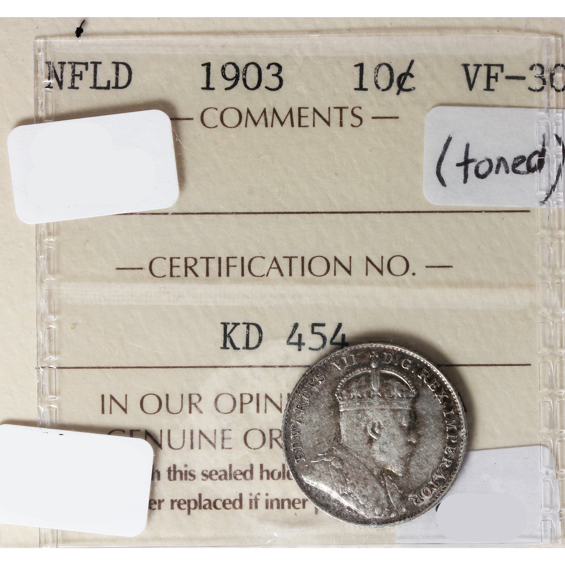 1903 Newfoundland 10-cents ICCS Certified VF30 Toned