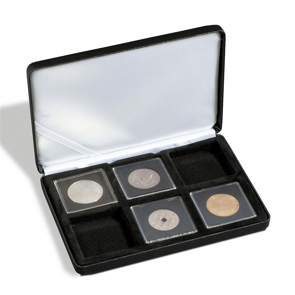 For an elegant yet affordable presentation of encapsulated coins we recommend these high-quality coin boxes with silk-lined lid and black velvet inlay. A satin ribbon inside the lid can hold a personal message if desired. A sturdy metal frame protects the coin and is covered with matt black leatherette. Overall size: 7 1/8 x 4 7/8\ x 1\" (181 x 123 x 26 mm). Fits LIGHTHOUSE capsule QUADRUM. Use for all coins from 14 to 41 mm diameter."