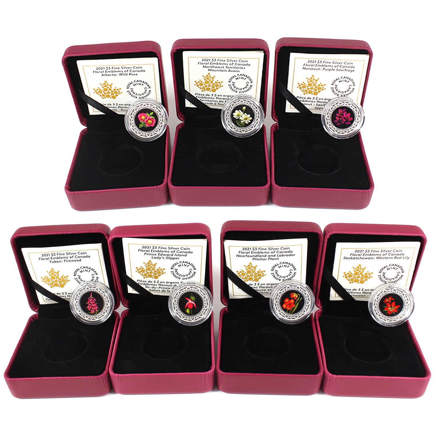 A vintage style: The coin’s reverse proof finish gives it the look of vintage silver jewellery. This perfectly complements the colour portraits at the centre of Royal Canadian Mint's floral-themed celebration of Canada. Each coin contains 7.96 g of 99.99% pure silver, and were designed by Lisa Thomson-Khan. They come with their original clamshell cases, and COAs, but are missing their outer cardboard sleeves.