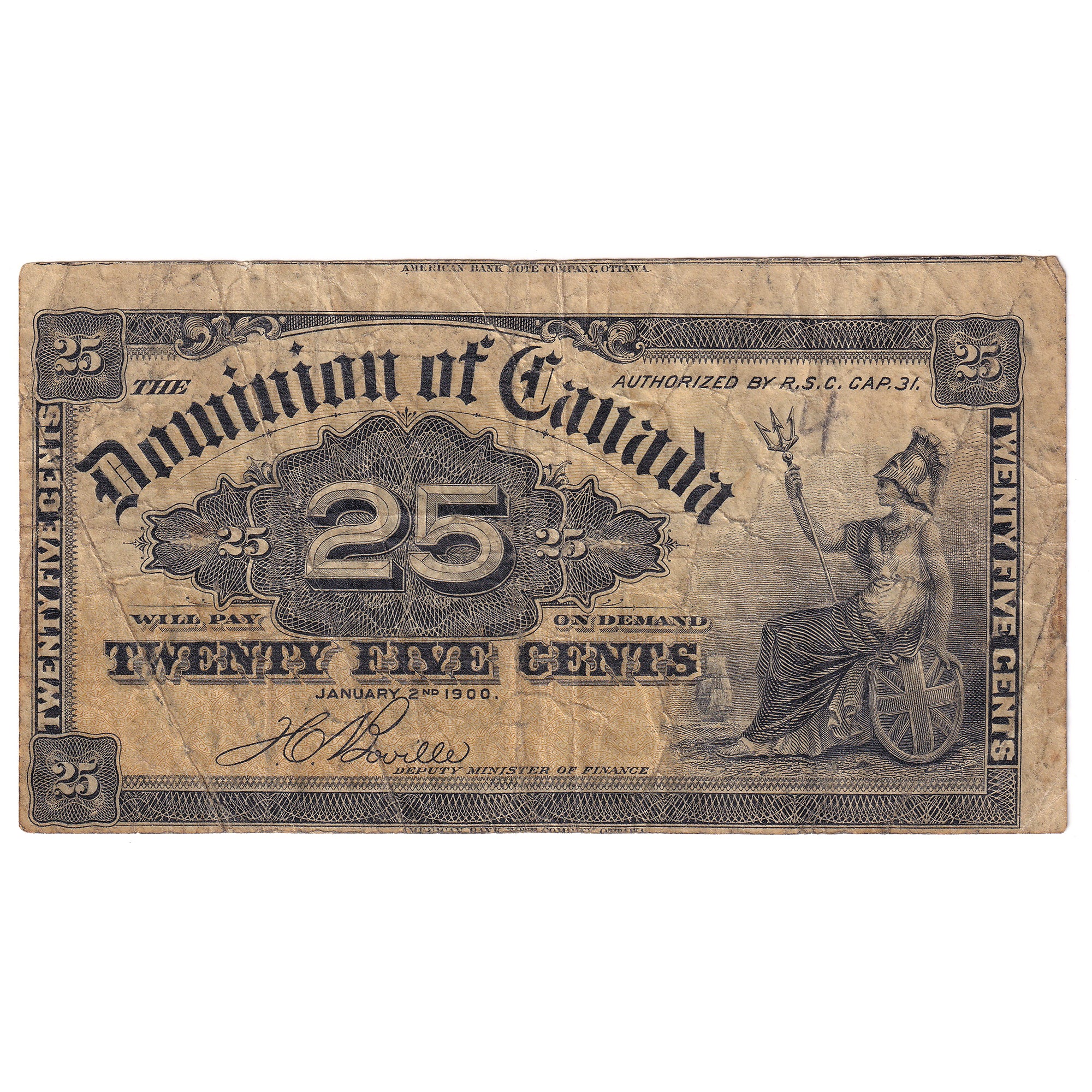 DC-15b-E25a-i 1900 Dominion 25-cent Shinplaster, Boville, F (Cut off Size)