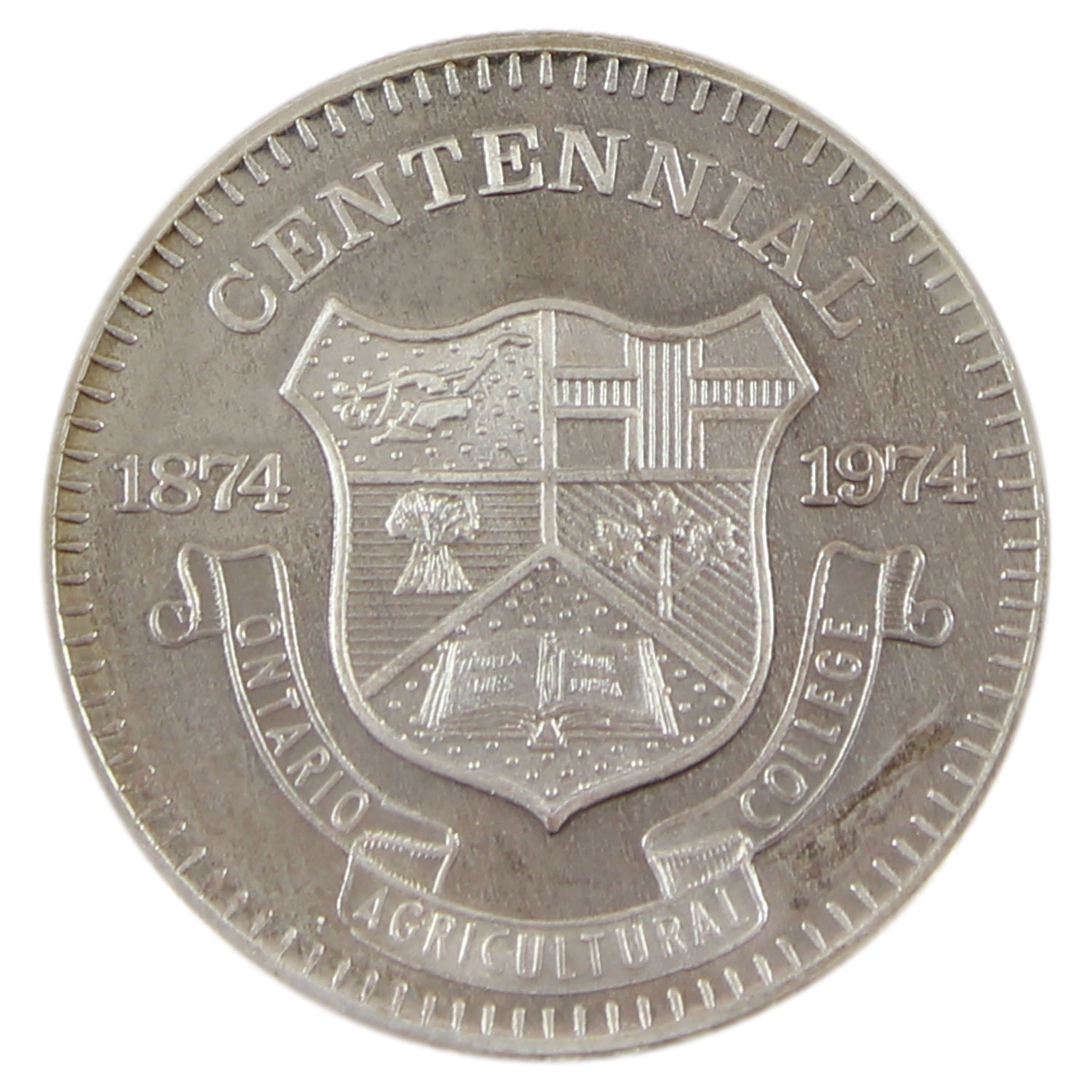 The 1974 Guelph, ON, Silver Centennial Dollar Trade Token: Ontario Agricultural College was issued to commemorate the 100th anniversary of the Ontario Agricultural College, which originated at the agricultural laboratories of the Toronto Normal School and was officially founded in 1874 as an associate agricultural college of the University of Toronto. Since 1964, the college has been affiliated with the University of Guelph, which operates campuses in Guelph and Ridgetown. The coin is housed in a small pocket folder and is struck in .999 fine silver. Please note the token has some light toning.