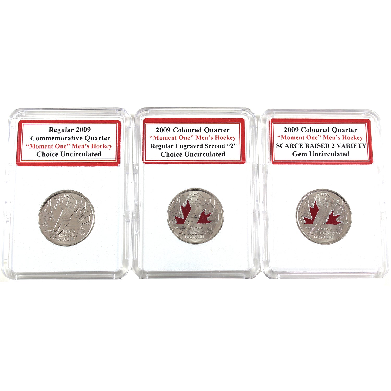 This lot features three Canada 25-cent Olympic Men's Hockey released in 2009 released by the Royal Canadian Mint as part of the Olympics Golden Moment series. The Men's Ice Hockey coin was issued to commemorate Canada's Gold Medal win against the United States in a 5-2 Win in the Gold Medal Game during the 2002 Winter Olympics in Salt Lake City, Utah. The coins included are the coloured Men's Hockey Regular engraved "2" quarter in Choice Uncirculated condition, another coloured Men's Hockey of the Raised 2 variety quarter in Gem Uncirculated condition and an uncoloured Regular Men's Hockey quarter in Choice Uncirculated condition. The coins are housed in holders with some minor scuff and scratch marks.