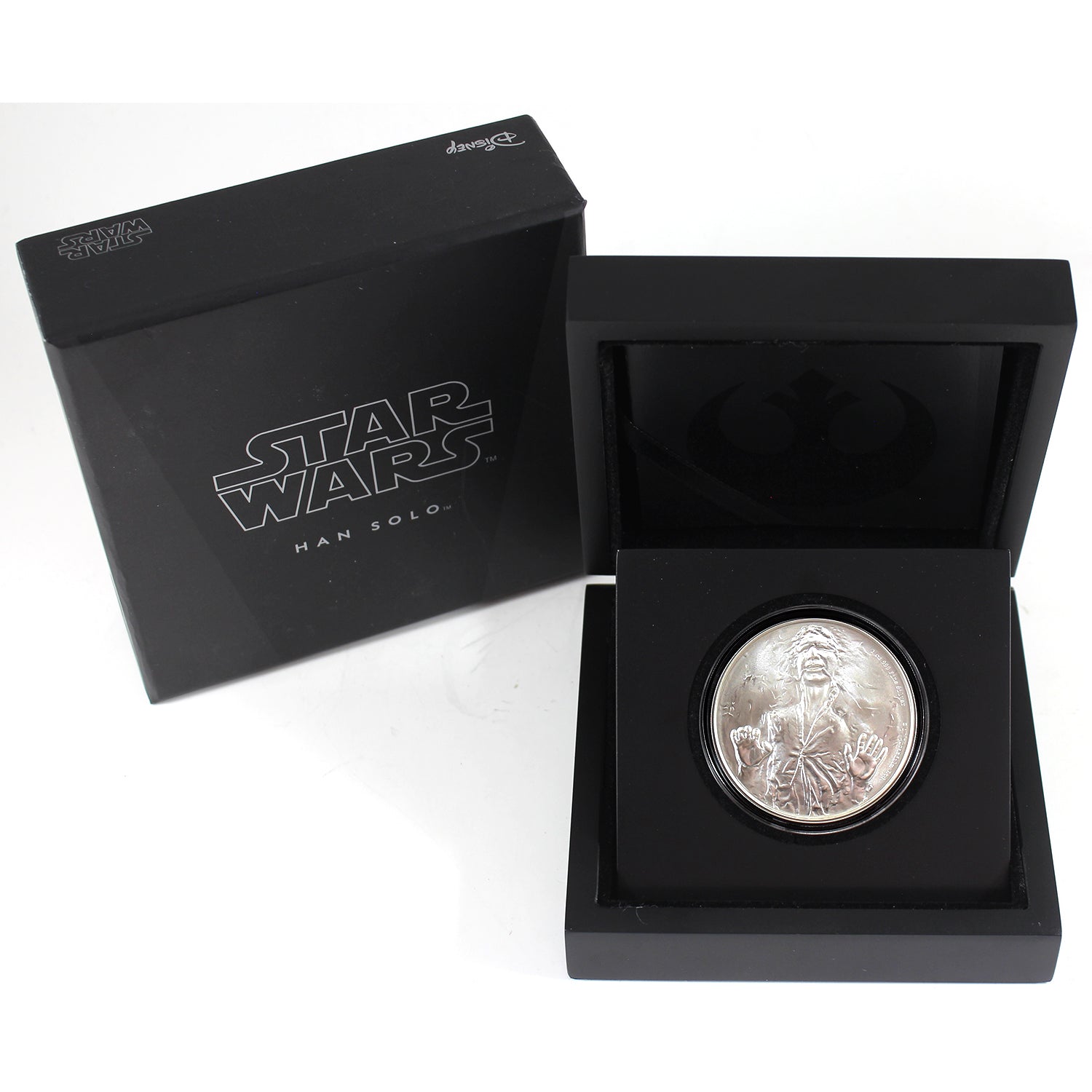 2016 Niue $2 Star Wars Han Solo 1oz. Fine Silver Coin was issued by the New Zealand Mint features the Smuggler, scoundrel, hero. Han Solo, Captain of the Millennium Falcon, was one of the greatest leaders of the rebel alliance. The obverse features the effigy of Her Majesty Queen Elizabeth II and the reverse shows Han Solo frozen in Carbonite, as in the 1980 release of Star Wars Episode V: The Empire Strikes Back. The coin is struck in .999 fine silver and weighs 1oz and comes in it's original packaging and includes its CoA.
