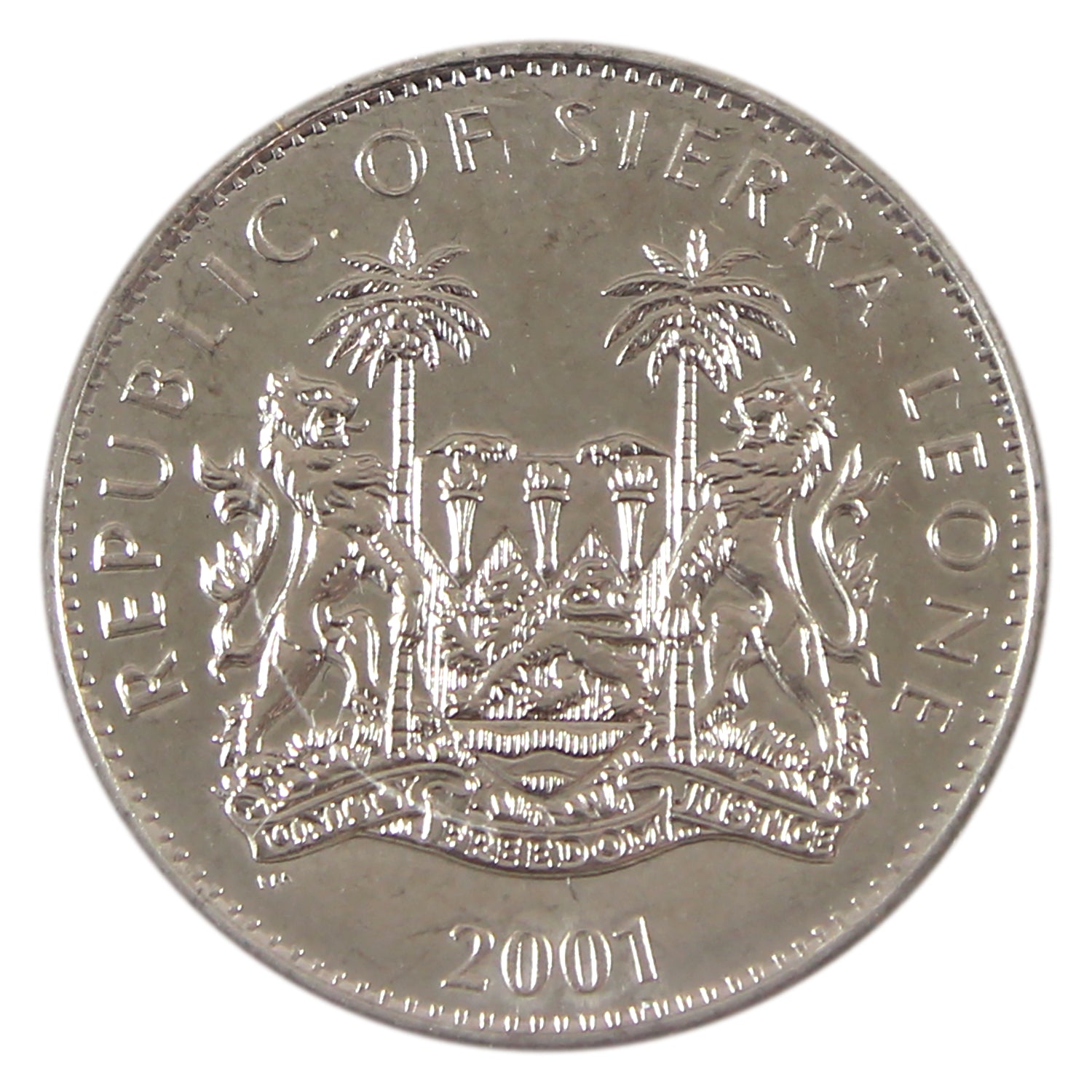 The 2001 Sierra Leone $1 Big Cats Colourized Tiger Copper-Nickel Coin was released by the Pobjoy Mint as part of the Big Cats of the World series. The obverse features the Sierra Leone coat of arms, while the reverse depicts a colorized tiger in a marsh. The coin is housed in a clam shell case, which shows light scuff marks.