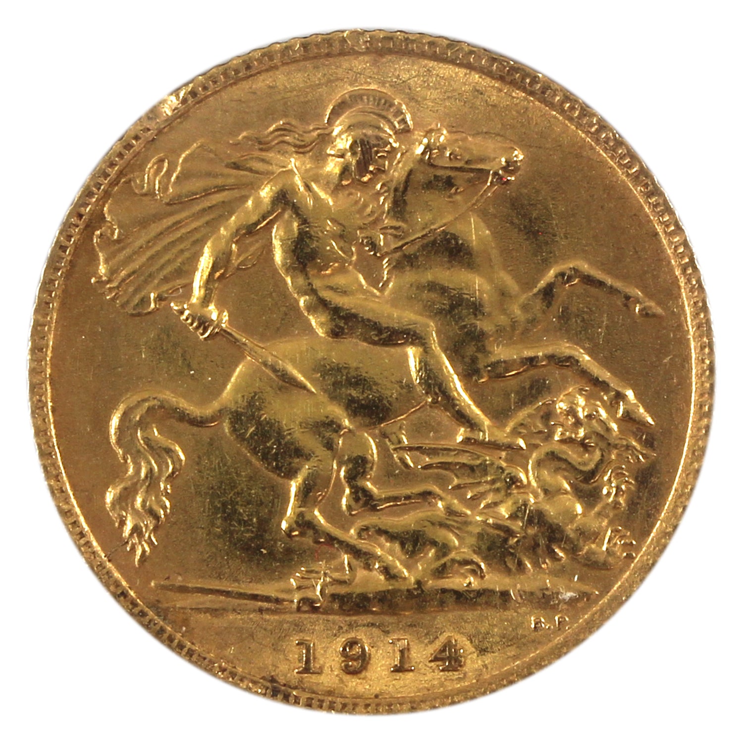 The Great Britain 1914 Gold 1/2 Sovereign contains 0.1177oz. of gold (.9167) and has the uncrowned portrait of King George V left on the obverse and the reverse depicts St Geroge on horseback slaying a dragon. The 1/2 sovereign is in Brilliant Uncirculated Condition and is impaired.