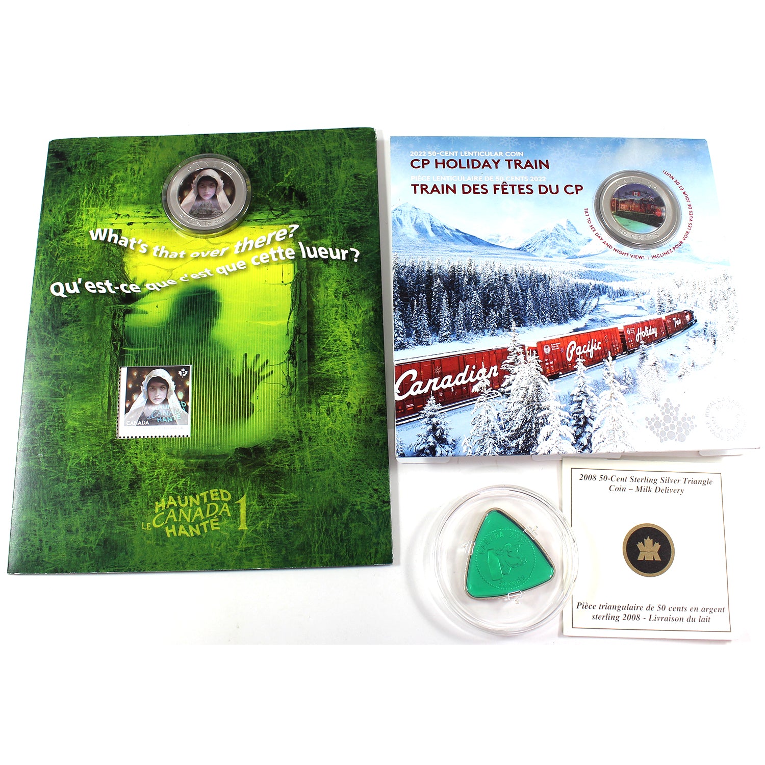 This lot features two Canada coins in cards and one Sterling Silver triangle coin. Included are the 2022 50-cent Lenticular Holiday Train coin, which shows the effigy of Queen Elizabeth II on the obverse and a lenticular reverse design depicting the CP Holiday Train by day and night as it travels across Canada, housed in its original card; the 2014 Lenticular 25-cent Ghost Bride coin, featuring Queen Elizabeth II on the obverse and a haunting portrait of a bride using lenticular technology with the Fairmont Banff Springs Hotel visible below, housed in a themed card with Haunted Canada stamps that shows light wear, while the capsule has light scratches; and the 2008 50-cent Sterling Silver Milk Delivery triangle coin, showing Queen Elizabeth II on the obverse and a cow’s head with a milk bottle on the reverse. The triangle coin is struck in .925 sterling silver, comes encapsulated as the coin only, and includes its Certificate of Authenticity (CoA).