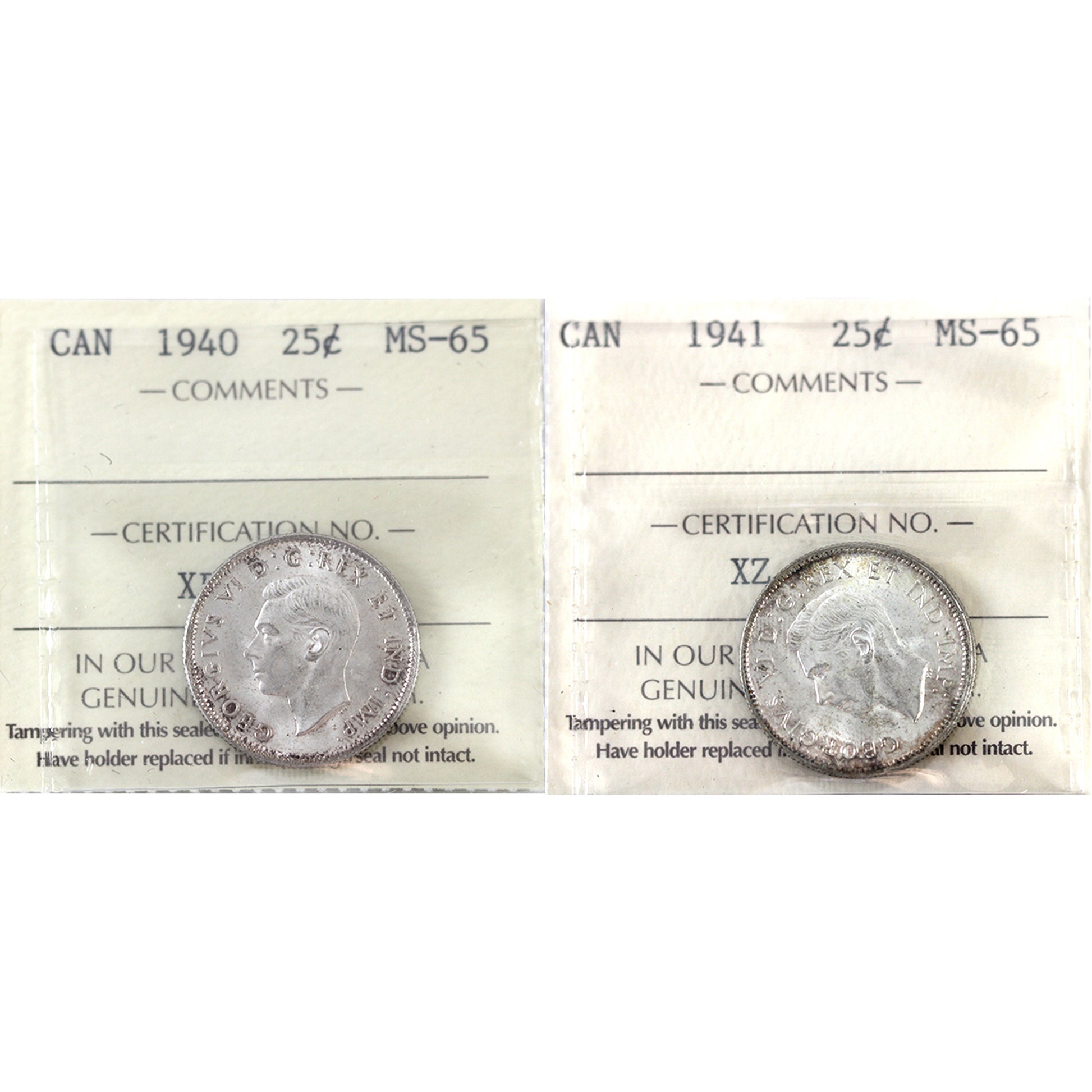 Pair of 1940 & 1941 Canada 25-cents ICCS Certified MS-65 (2pcs)