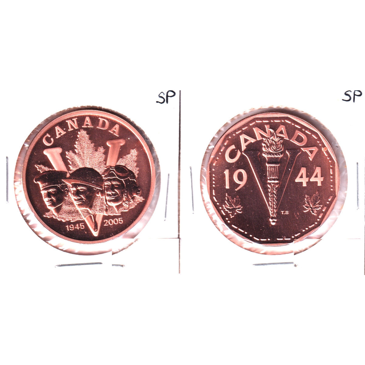 These medallions originate in the 2004 and 2005 60th Anniversary 5-cent and Medallion sets with CD released by the Royal Canadian Mint. This pair includes the D-Day and VE-Day commemorative medallions (only), beautiful pieces with a timeless significance.