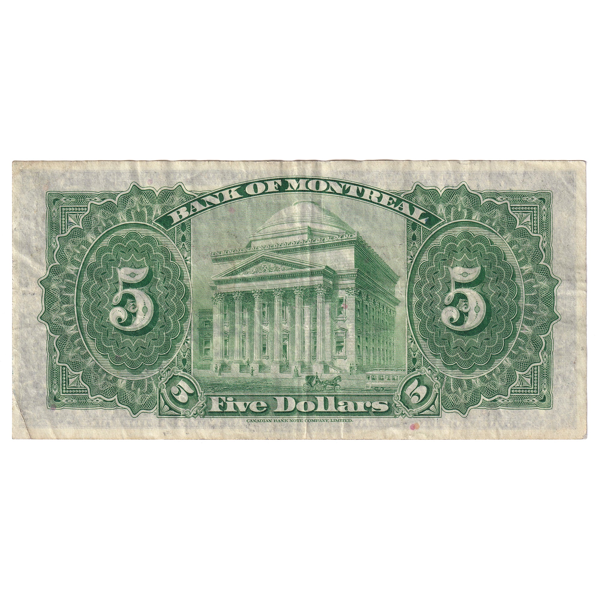 Back Design: Lathework, counters, bank name and, at centre, the head office of the Bank of Montreal, on 119 rue Saint Jacques in Montreal.