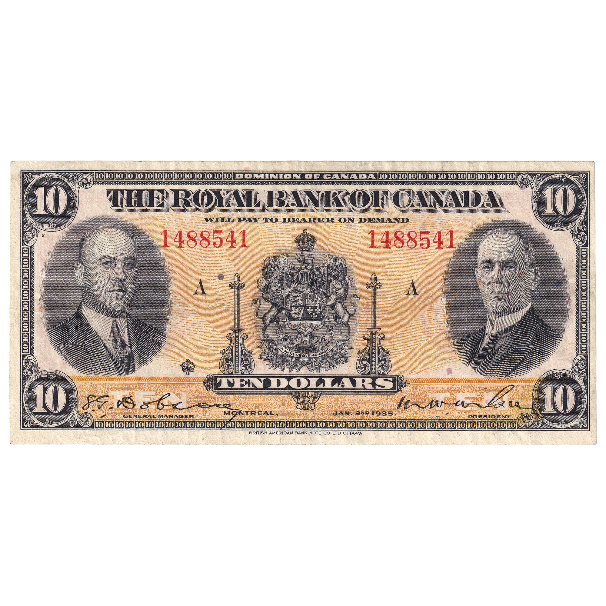 Face Design: Morris W. Wilson at left, the Coat of Arms in the centre, Sir Herbert S. Holt at right.