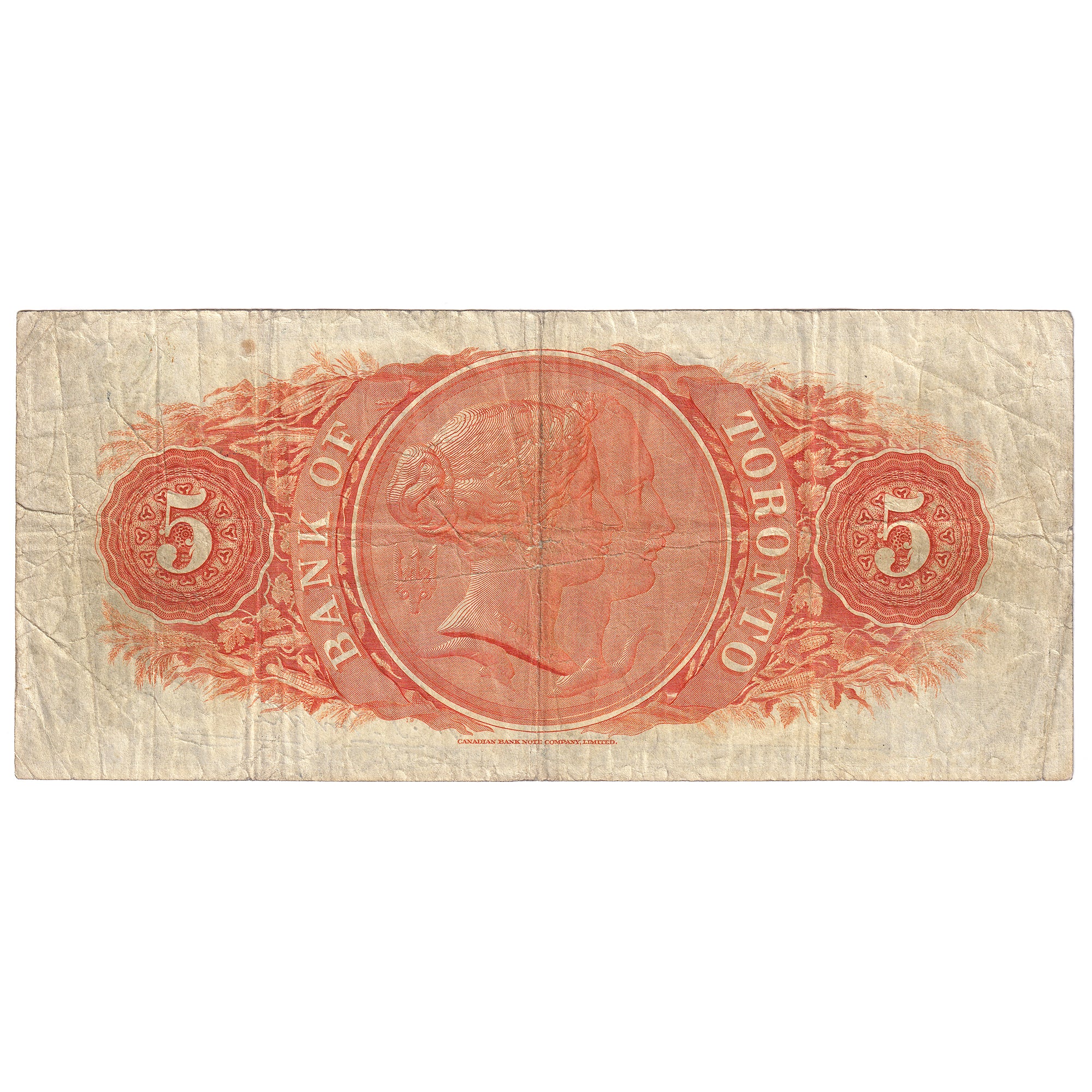 Face Design: A woman wearing a laurel crown at left, the Royal Crest with a small crest of Toronto above, both above the denomination at centre, and sideways at right, seated Commerce with a ship in the background.