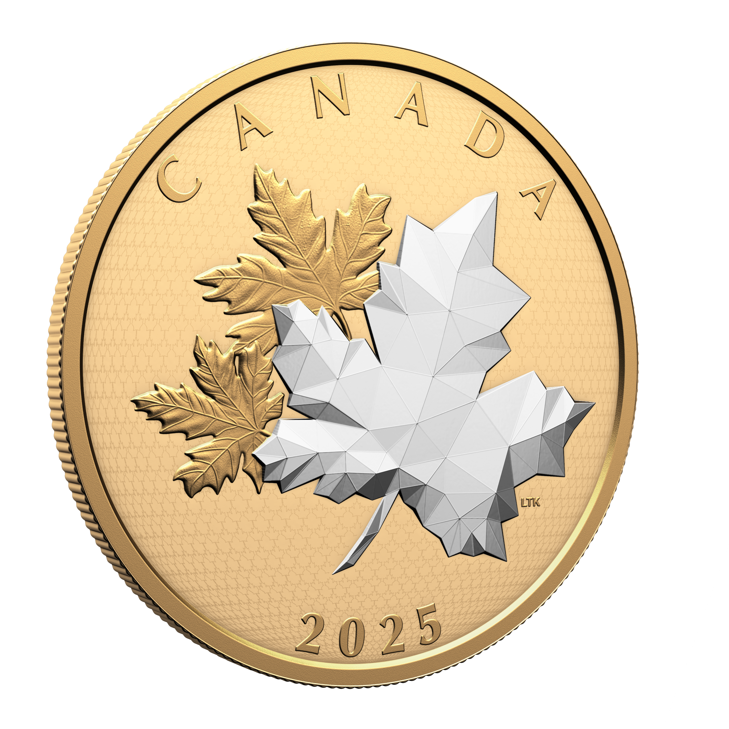 - Multifaced engraving. The two gold-plated maple leaves on the coin’s reverse are traditionally rendered, while multifaceted engraving takes a more geometric approach to maximizing light play on the non-plated leaf in the foreground.