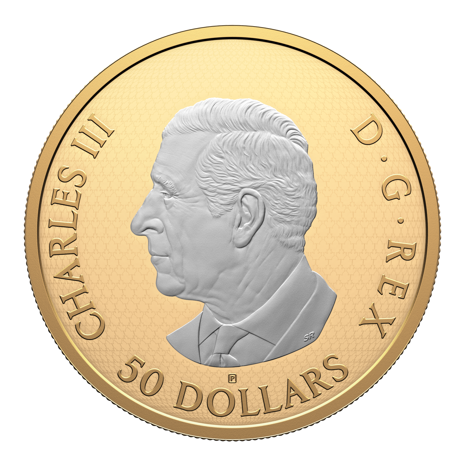Designed by Canadian artist Lisa Thomson-Khan, the coin’s reverse features two traditionally engraved sugar maple (Acer saccharum) leaves and a third leaf brought to life by multifaceted engraving. The contrast between the engraving styles is further heightened by the application of yellow gold plating to all but the foremost leaf, while a laser-engraved maple leaf pattern fills the field. The pattern repeats on the obverse, which is also almost entirely plated with yellow gold, save for the effigy of His Majesty King Charles III by Canadian artist Steven Rosati.