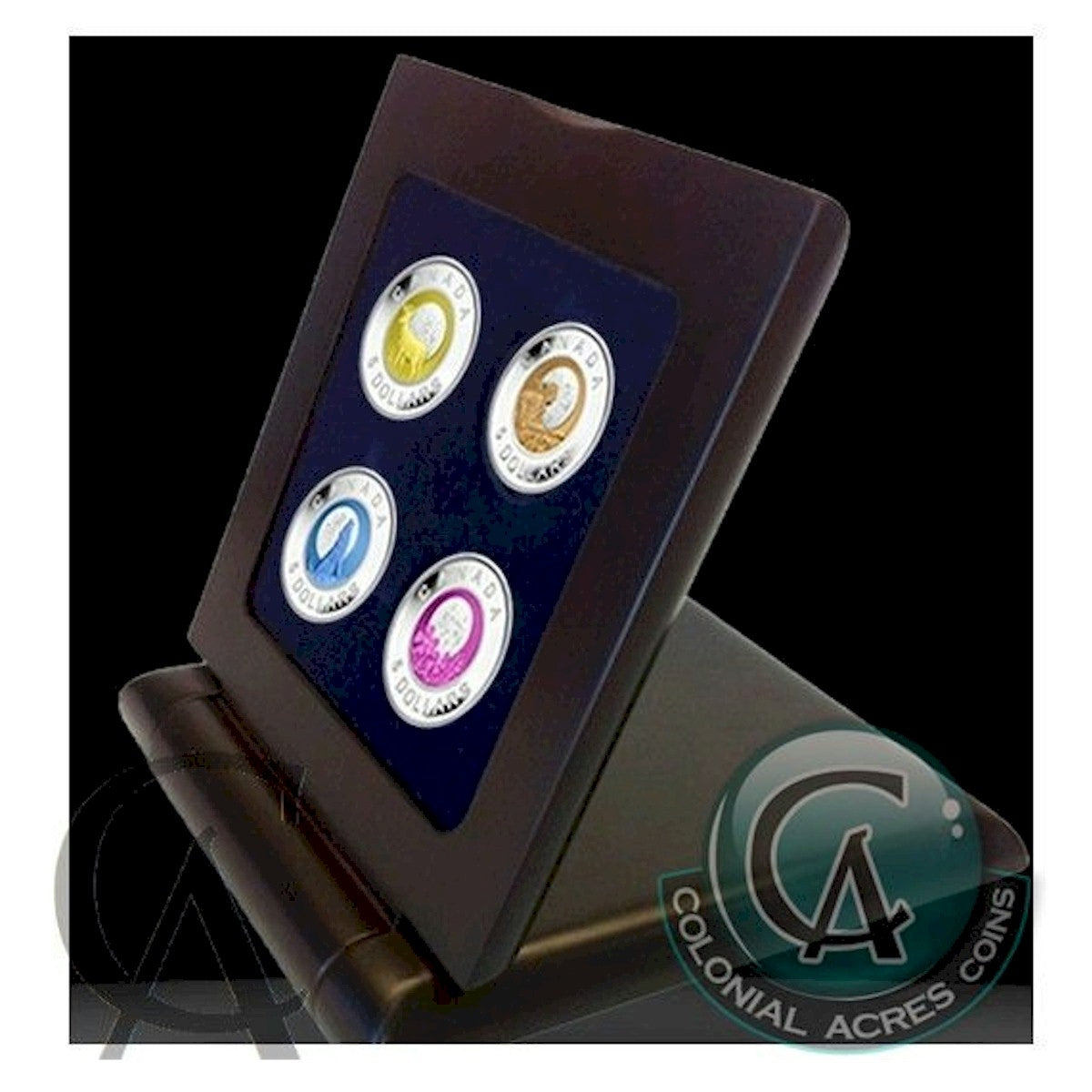 Coins are encapsulated and presented in a wooden flip case, lined with flock and protected by a black sleeve.