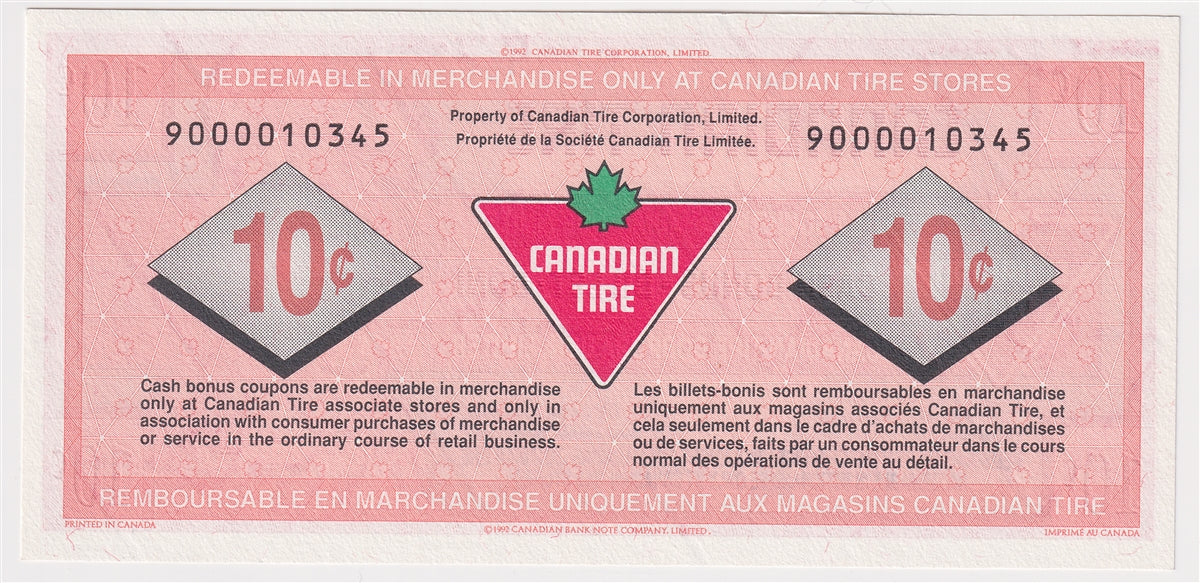 S15-Ca-90 Replacement 1992 Canadian Tire Coupon 10 Cents Uncirculated