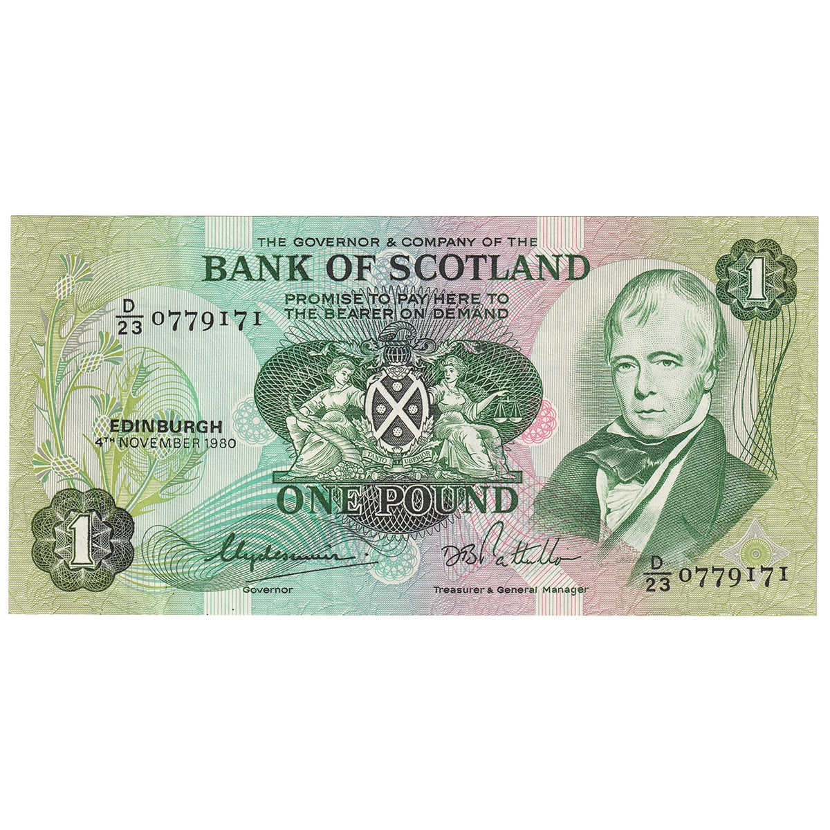 Scotland 1980 1 Pound Note, Pick #111d, Bank of Scotland, EF-AU