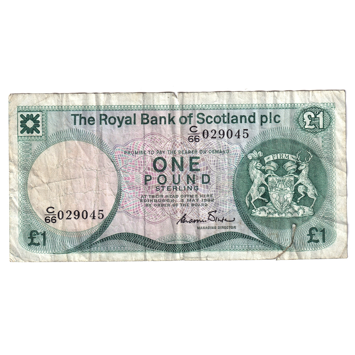 Scotland 1982 Royal Bank of Scotland 1 Pound Note, SC831a, C/66, VF (damaged)