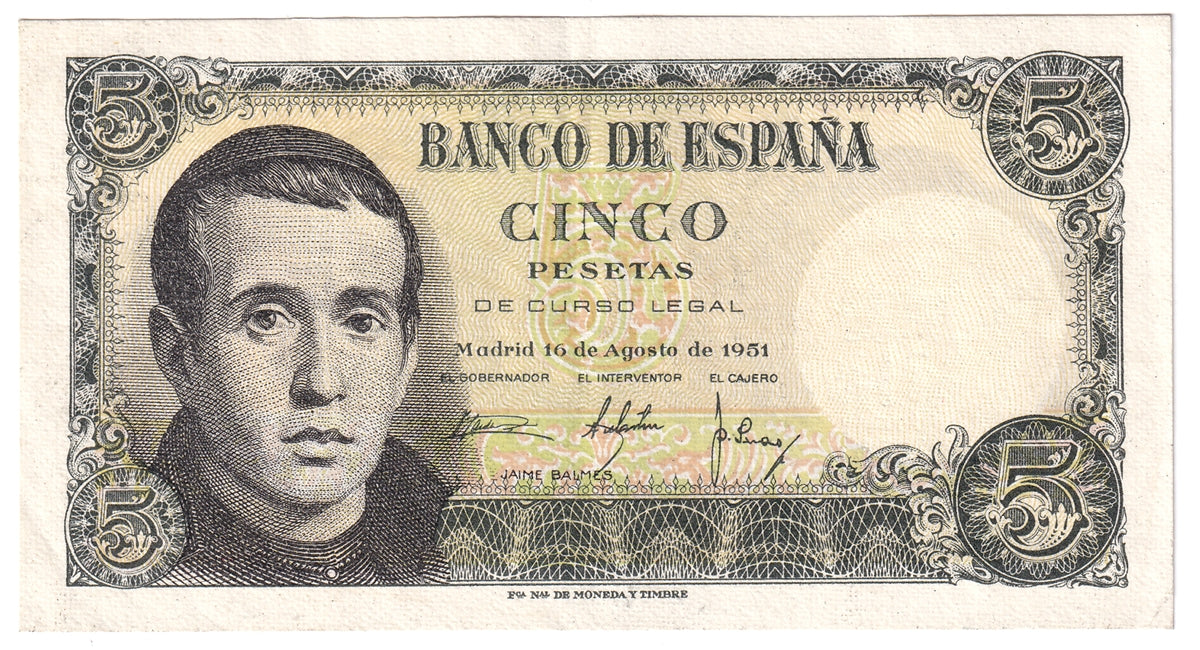 Spain Note Pick #140 1951 5 Pesetas EF-AU