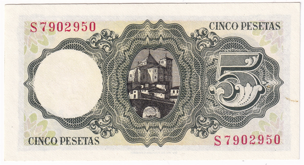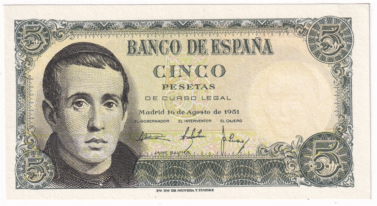 Spain 1951 5 Pesetas Note, Pick #140a, UNC