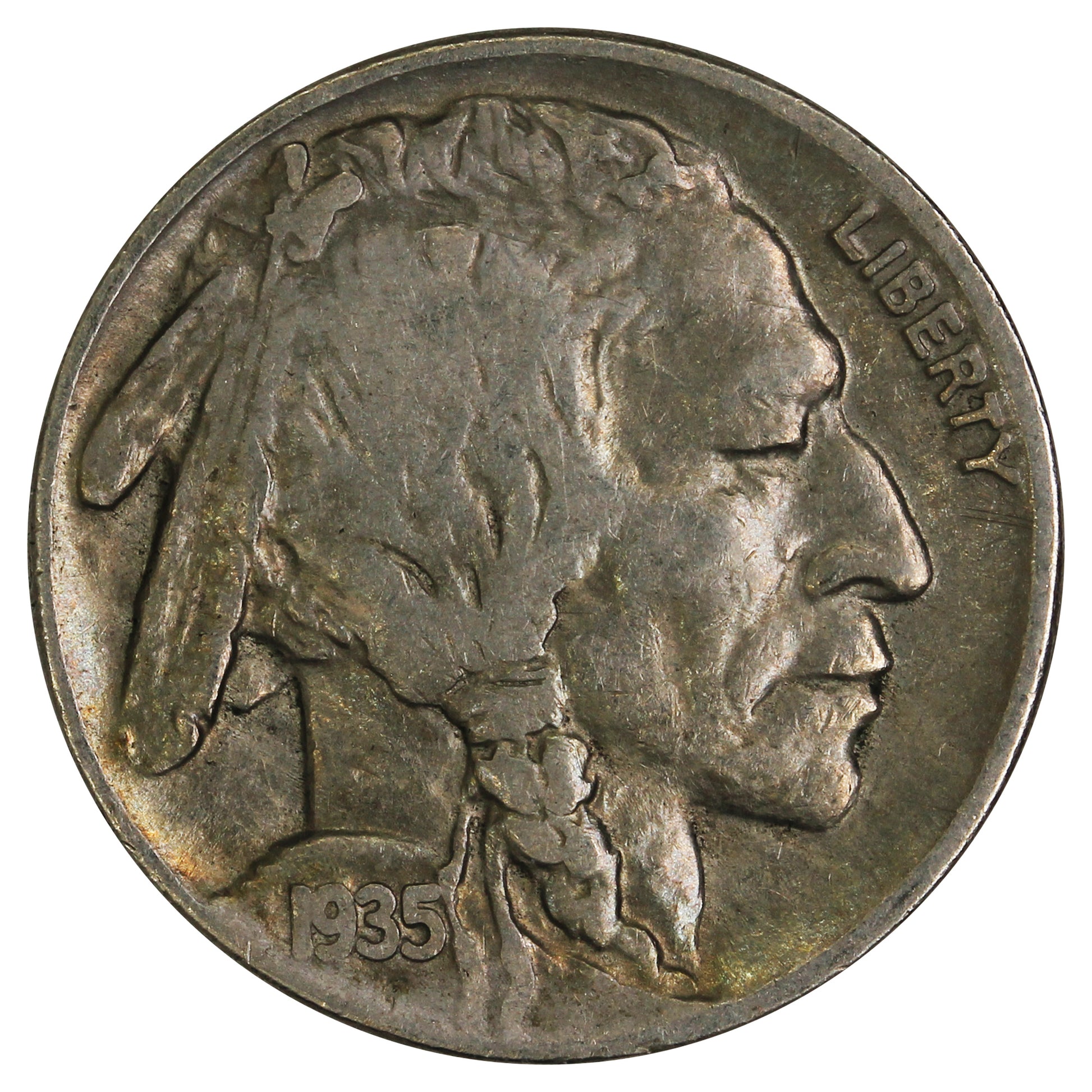 Obverse: Composite profile of a Native American, thought to be Iron Tail (Oglala Lakota), Two Moons (Northern Cheyenne), and Big Tree (Kiowa), with the date below and the word "Liberty" at 2 o'clock.