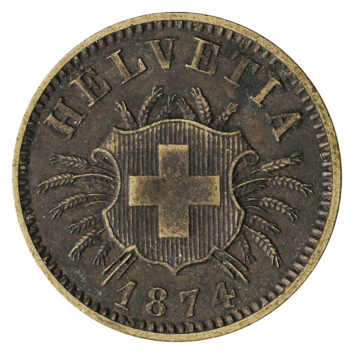 Obverse: The coat of arms of Switzerland on an ornate shield, with ears of wheat behind, and date below.