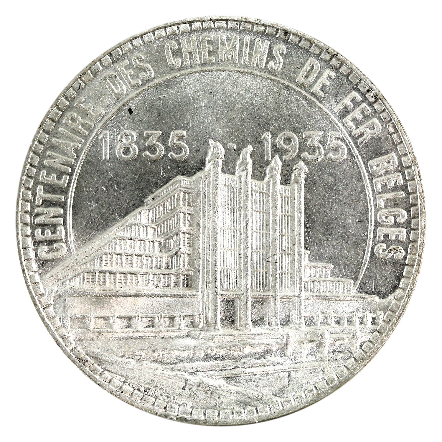 The 1935 Belgian 50 Francs, issued in French, commemorates both the Brussels International Exposition and the centenary of the Belgian railway system. The exposition, held from April 27 to November 25, 1935, was a world’s fair celebrating Belgium’s achievements and advancements. It attracted approximately 20 million visitors and featured exhibitions across scientific, industrial, and cultural fields. The coin also honors 100 years of Belgian railways, highlighting the nation’s progress in transportation and infrastructure over the past century.