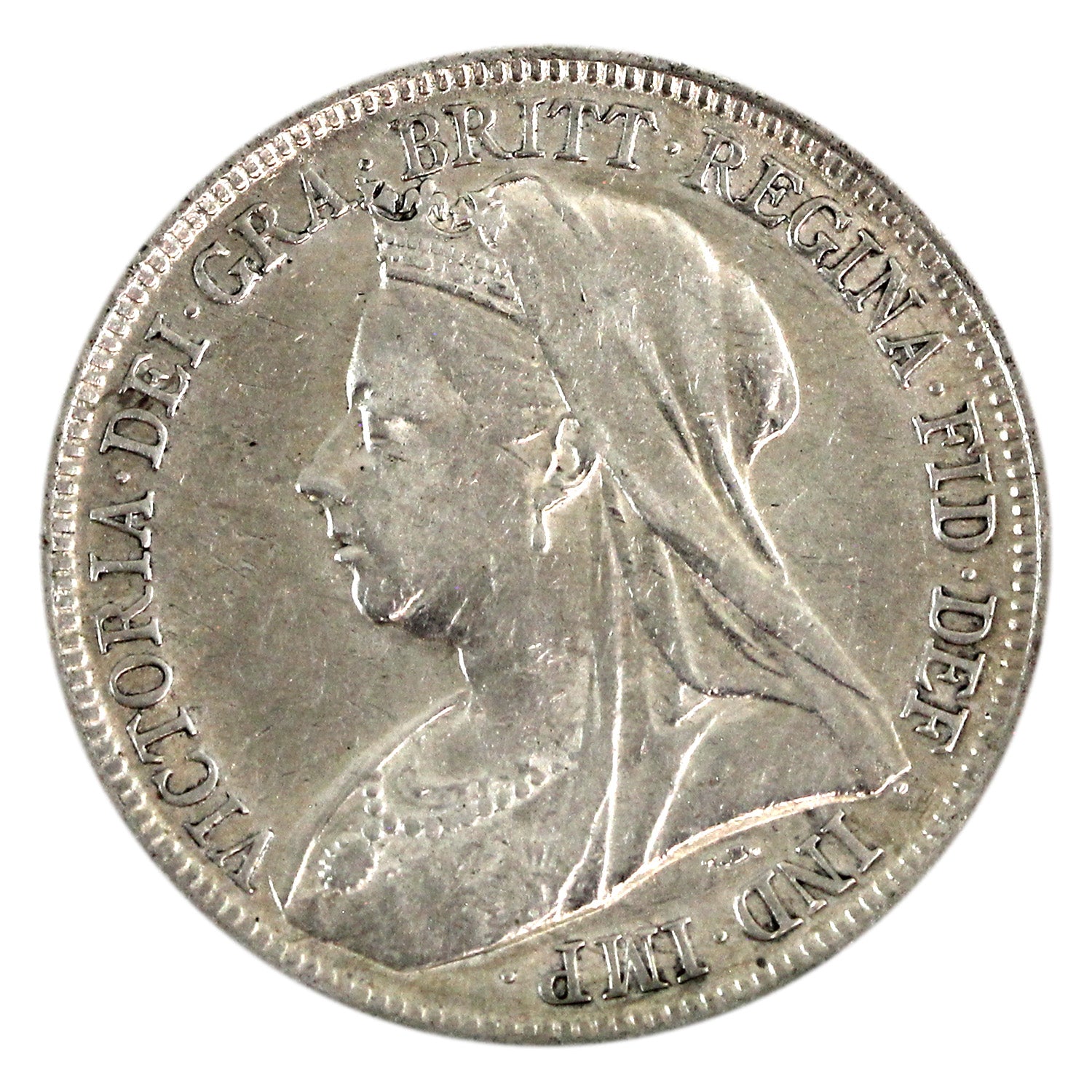 Obverse: Older veiled bust ("Old Head") of Queen Victoria facing left, with the legend around.