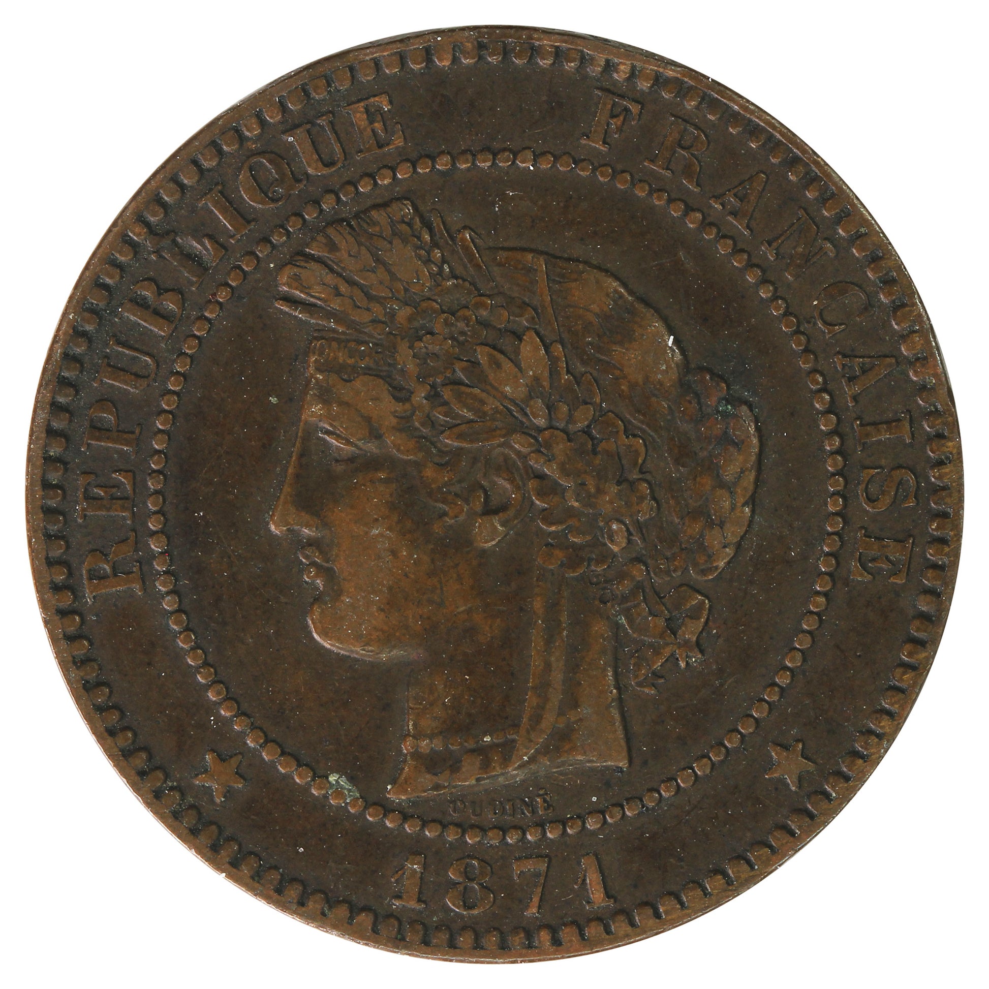 Obverse: Head of the Republic facing left as Ceres, wearing a pearl necklace, a double bun, and a composite crown of wheat, flowers, olive leaves with olives, oak leaves and acorns, and tied with a ribbon that descends down the neck, with the date below and legend around.