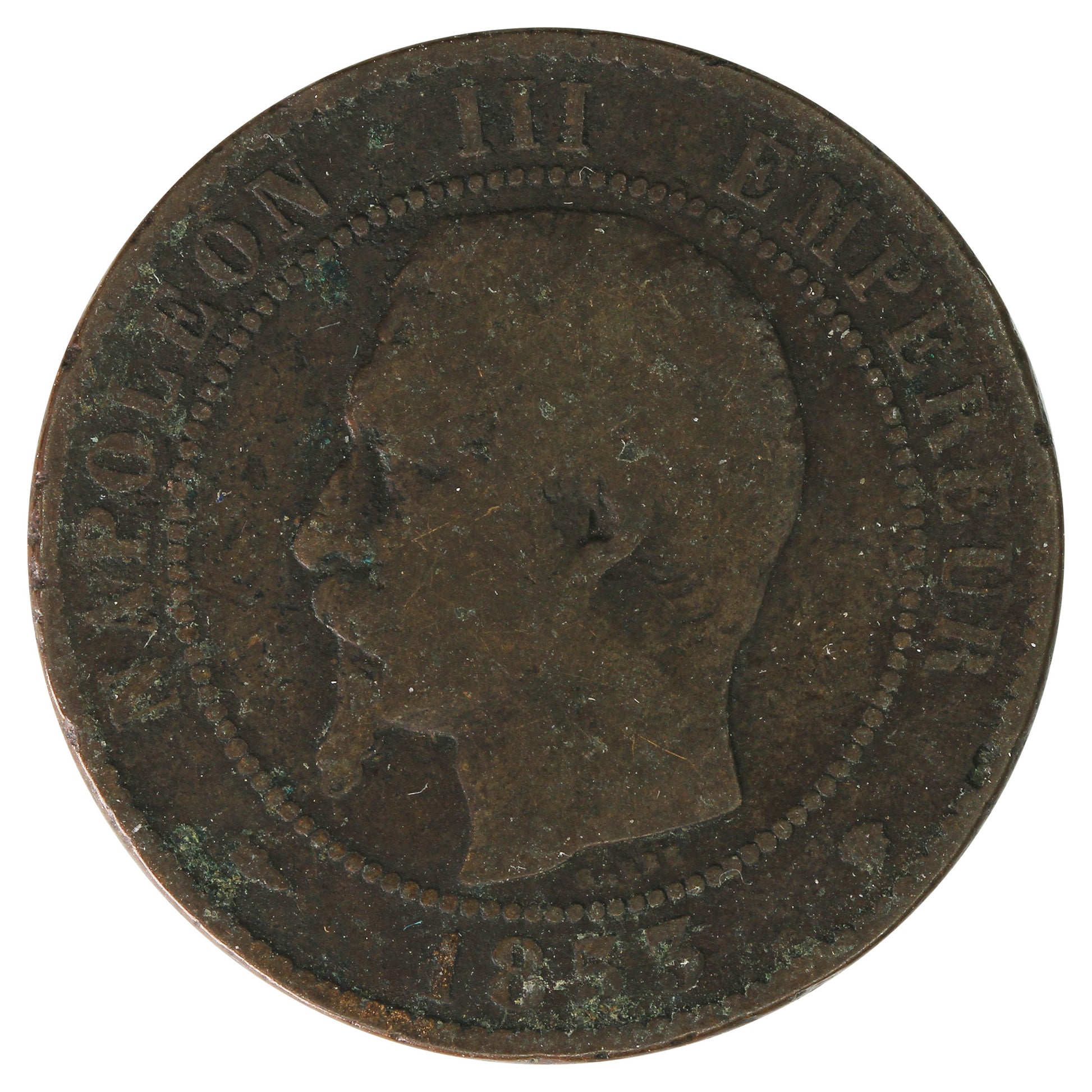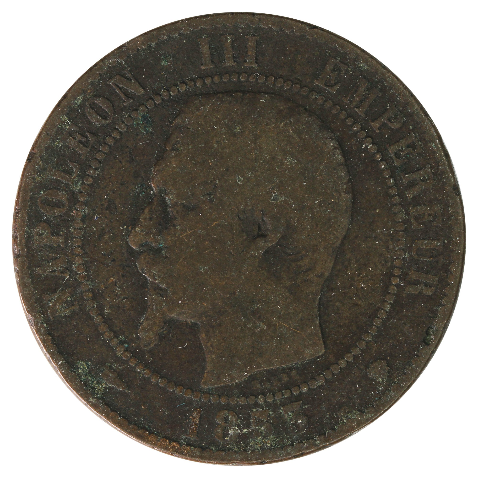 Obverse: Portrait of Napoleon III facing left within a beaded circle, date below, and legend around.