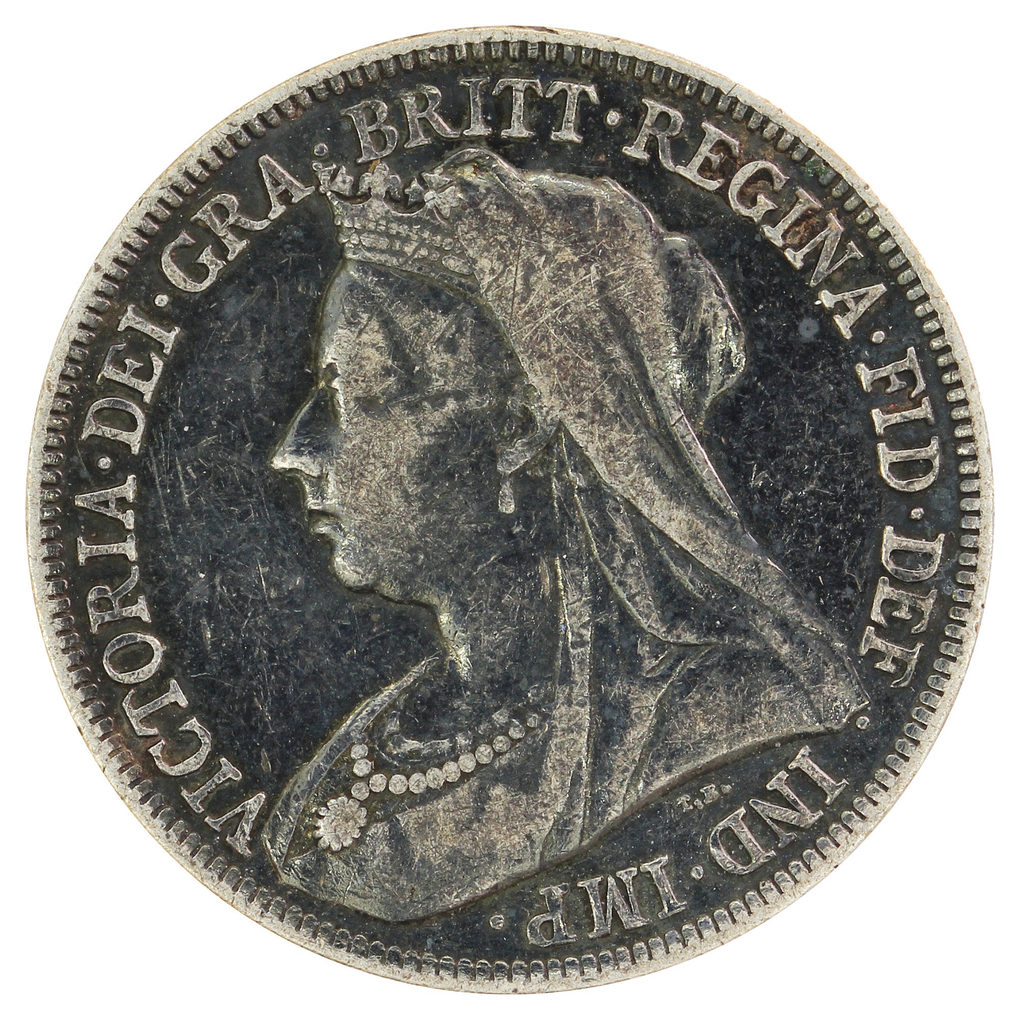 Obverse: Older veiled bust ("Old Head") of Queen Victoria facing left, with the legend around.