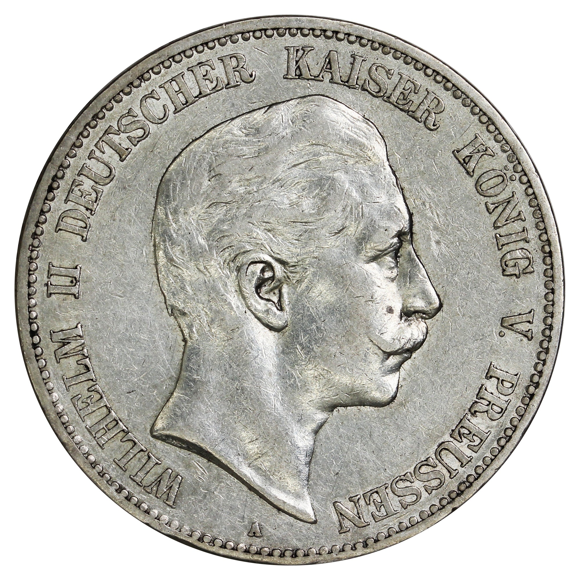 Obverse: The bust of Wilhelm II facing right, with the legend around, and mintmark below.