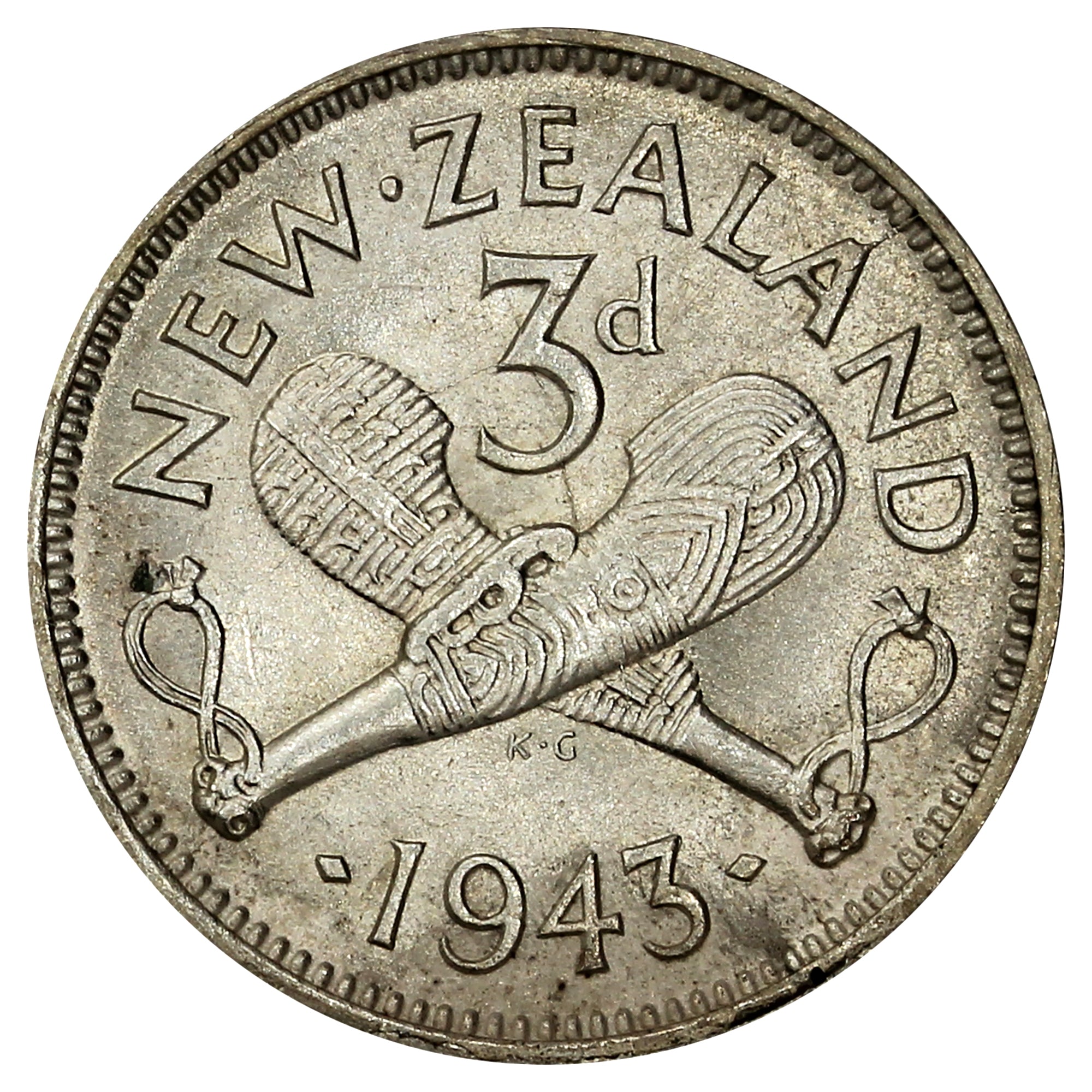 Reverse: Two carved patu (Maori short-handed clubs) with the denomination and legend above, date below.