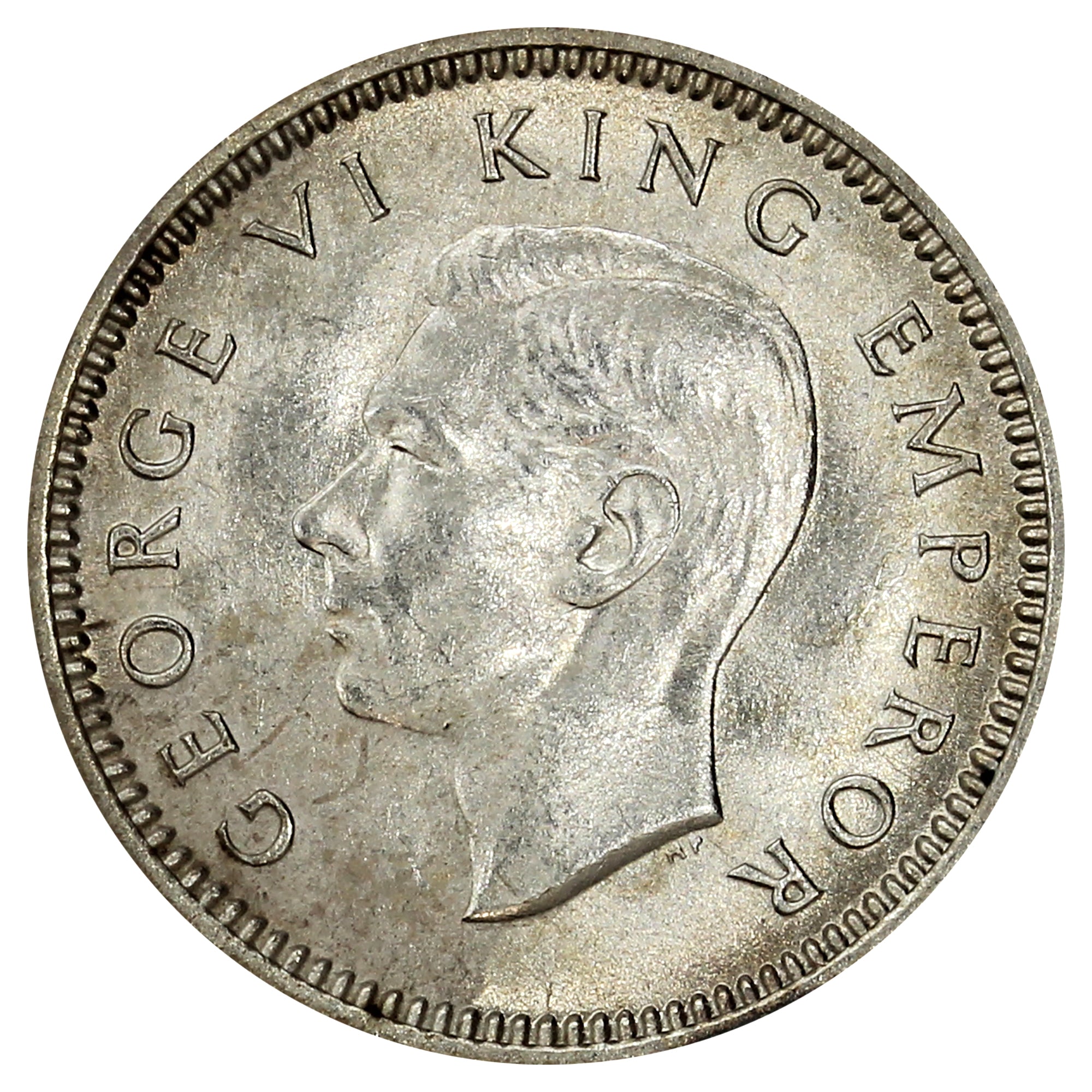 Obverse: Uncrowned portrait of George VI facing left, with the legend around.